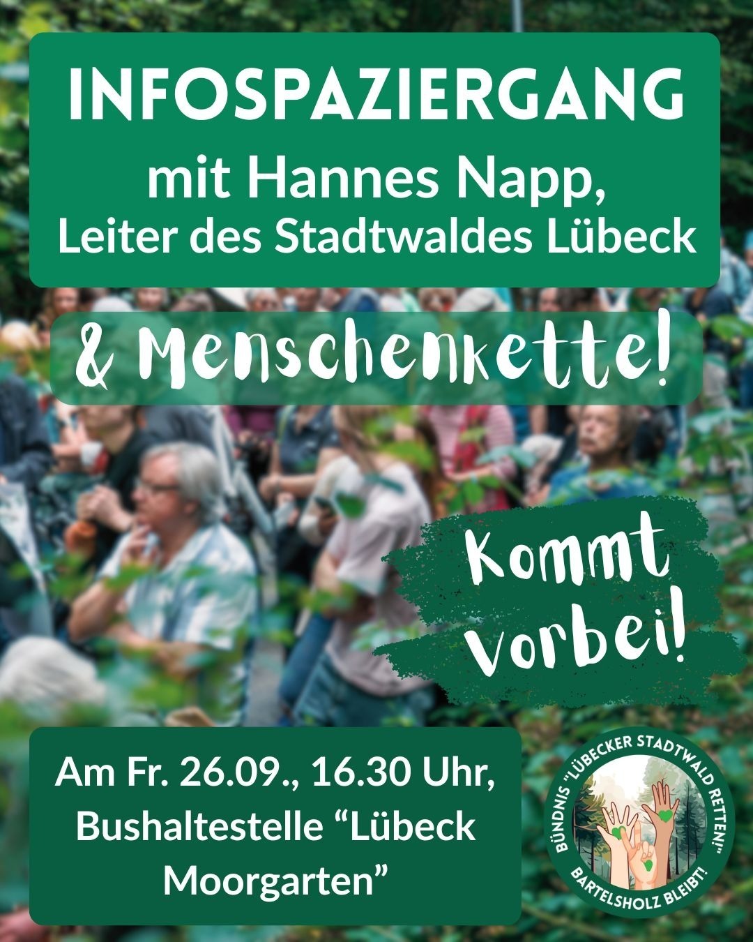 Ein Bündnis von BUND Lübeck, Ende Gelände Lübeck, Frauenverband Courage, Freunde des Stadtwaldes Lübeck, Fridays for Future Lübeck, #GemeinsamBuddeln, Greenpeace Lübeck, La Rage Lübeck, NABU Lübeck, Naturfreigeist, Naturschutzbeirat Lübeck, Naturwaldakademie,Naturwald Akademie, Omas for Future Lübeck, Psychologists for Future Lübeck, Stadtverwaldung Lübeck, Umweltgewerkschaft Lübeck