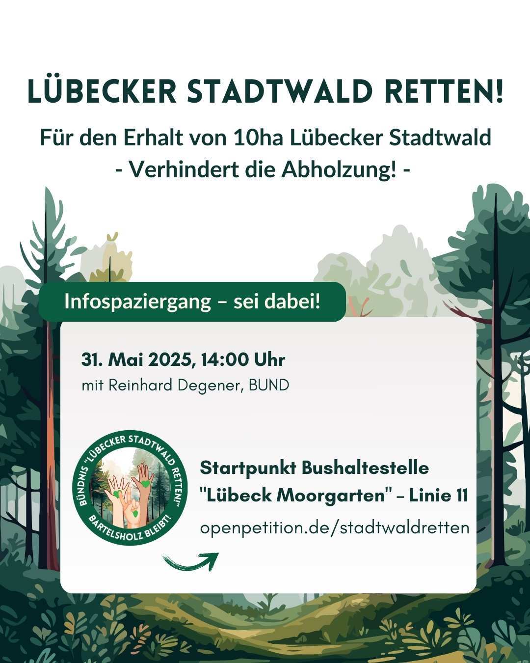 Das Bündnis „Lübecker Stadtwald retten!“ setzt sich für den Erhalt von 10 Hektar Lübecker Stadtwald ein. Ihr habt im Mai gleich zwei Möglichkeiten, uns und den Wald näher kennenzulernen: