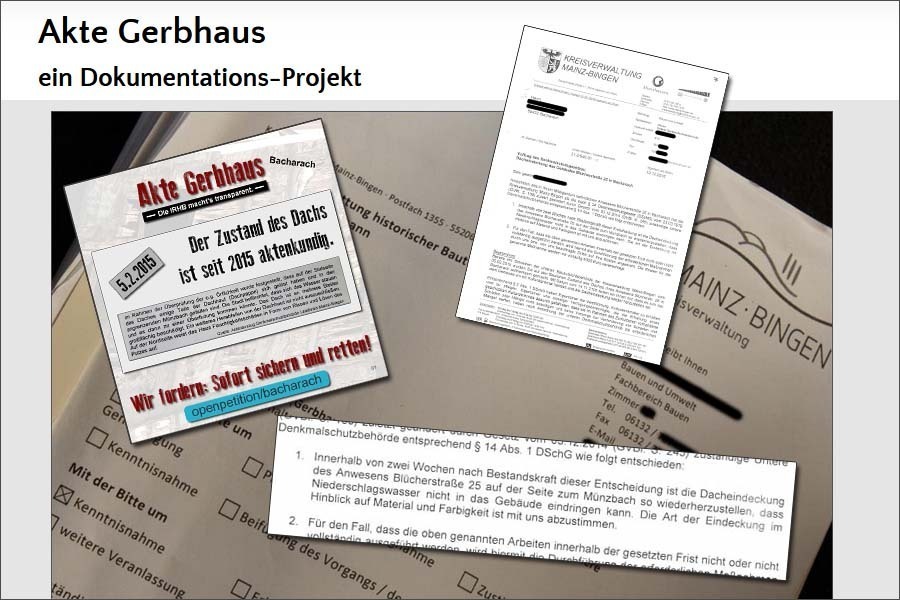 Wir haben uns in den letzten Wochen tief in die Denkmalakte zum Bacharacher Gerbhaus vergraben. Daraus entstanden sind einige Artikel, in die wir unsere vorhandenen Erfahrungen mit Denkmalen und der Denkmalpflege einbringen. Die Denkmalpflege kommt dabei nicht gut weg. (Zu finden sind diese Artikel unter irhb.de/akte-gerbhaus/)