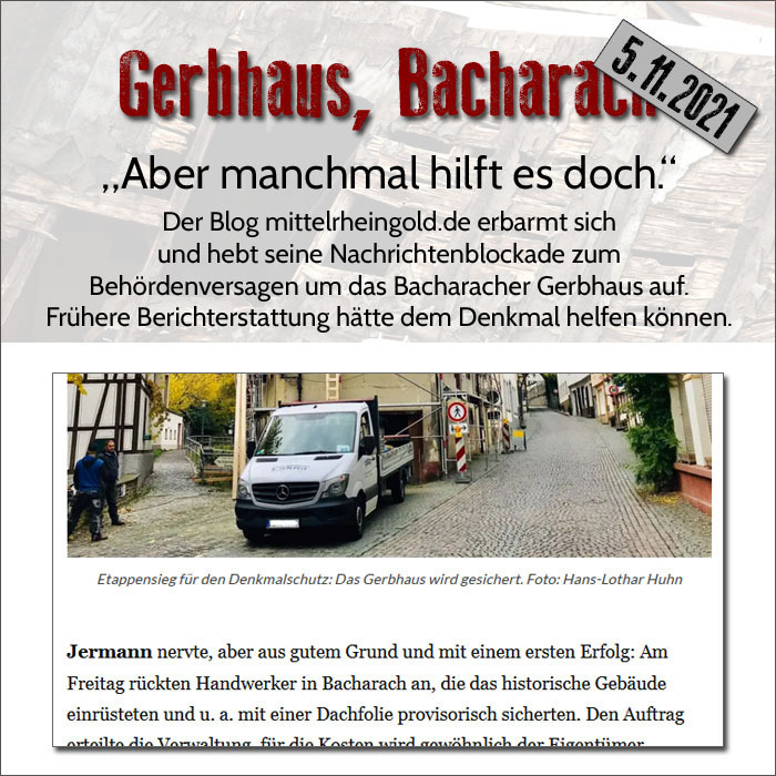 Wie üblich setzen wir Fakten dagegen: Endlich wurde das Bacharacher Gerbhaus eingerüstet. Endlich — man hätte das bereits vor sieben Jahren veranlassen können! — wurde über das offene Dach eine provisorische Plane gezogen. Ob das Kulturdenkmal damit aber gerettet ist, bleibt offen.