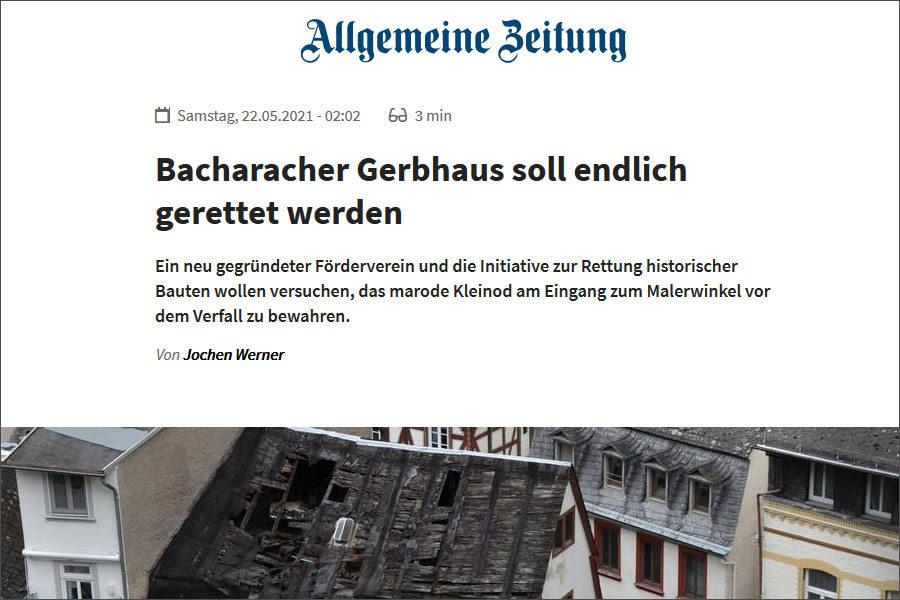 Am 22. Mai 2021 berichtete die Allgemeine Zeitung über den Fall des Bacharacher Gerbhauses. Aus dem Artikel ergeben sich interessante Einblicke, aber auch unbegreifliche Positionen, die zur Verwunderung Anlass geben.