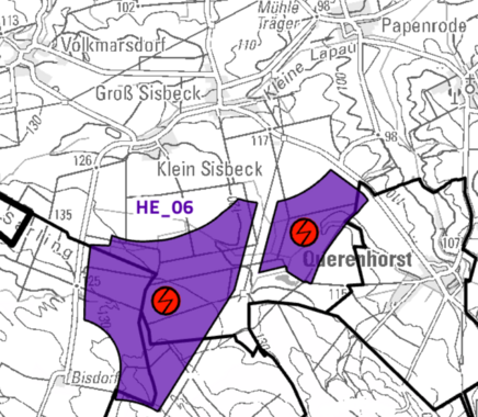 Der Clou: Genau dieses Prinzip der „Überbauung“ greift auch bei uns in Klein Sisbeck! Denn mit dem riesigen neuen Windvorranggebiet (siehe Karte) im Süden von Klein Sisbeck bis nach Querenhorst, welches nach unserer Schätzung 100 bis 150 MW elektrische Leistung bringen wird, steht auch der verantwortliche Netzbetreiber AVACON vor großen Herausforderungen. Die AVACON wird daher ein erhebliches Interesse haben, möglichst wenige, dafür kombinierte neue Netzanschlüsse, also neue Umspannwerke, schaffen zu müssen. In diesem Sinne passen die 76 MW Leistung der Freiflächenphotovoltaikanlage in Klein Sisbeck perfekt!