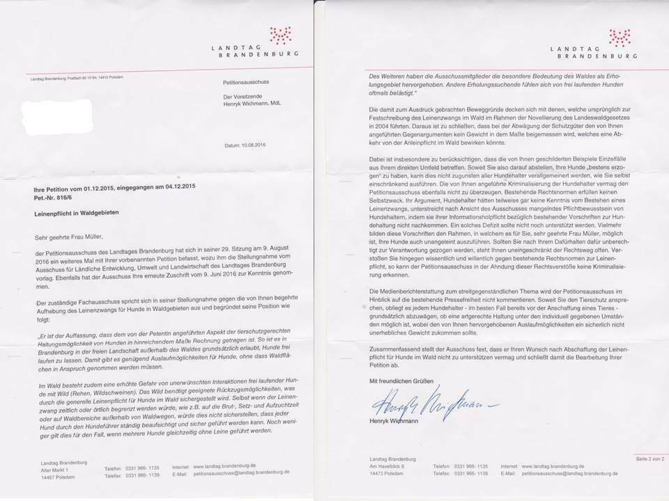es war ja zu erwarten, nach dem bereits vorangegangenen Schriftverkehr, dass wir auf keine Unterstützung aus dem Landtag hoffen dürfen. Der Ausschuß ist der Meinung, es gäbe genügend Freilaufflächen für Hunde, ohne diese aber auszuweisen. Ein entsprechendes Ersuchen an den Landtag, bitte präzise sämtliche Freilaufmöglichkeiten für Hunde in Brandenburg zu benennen, damit es auch in Zukunft zu keinen Mißverständnissen kommt, ist bereist abgeschickt worden.