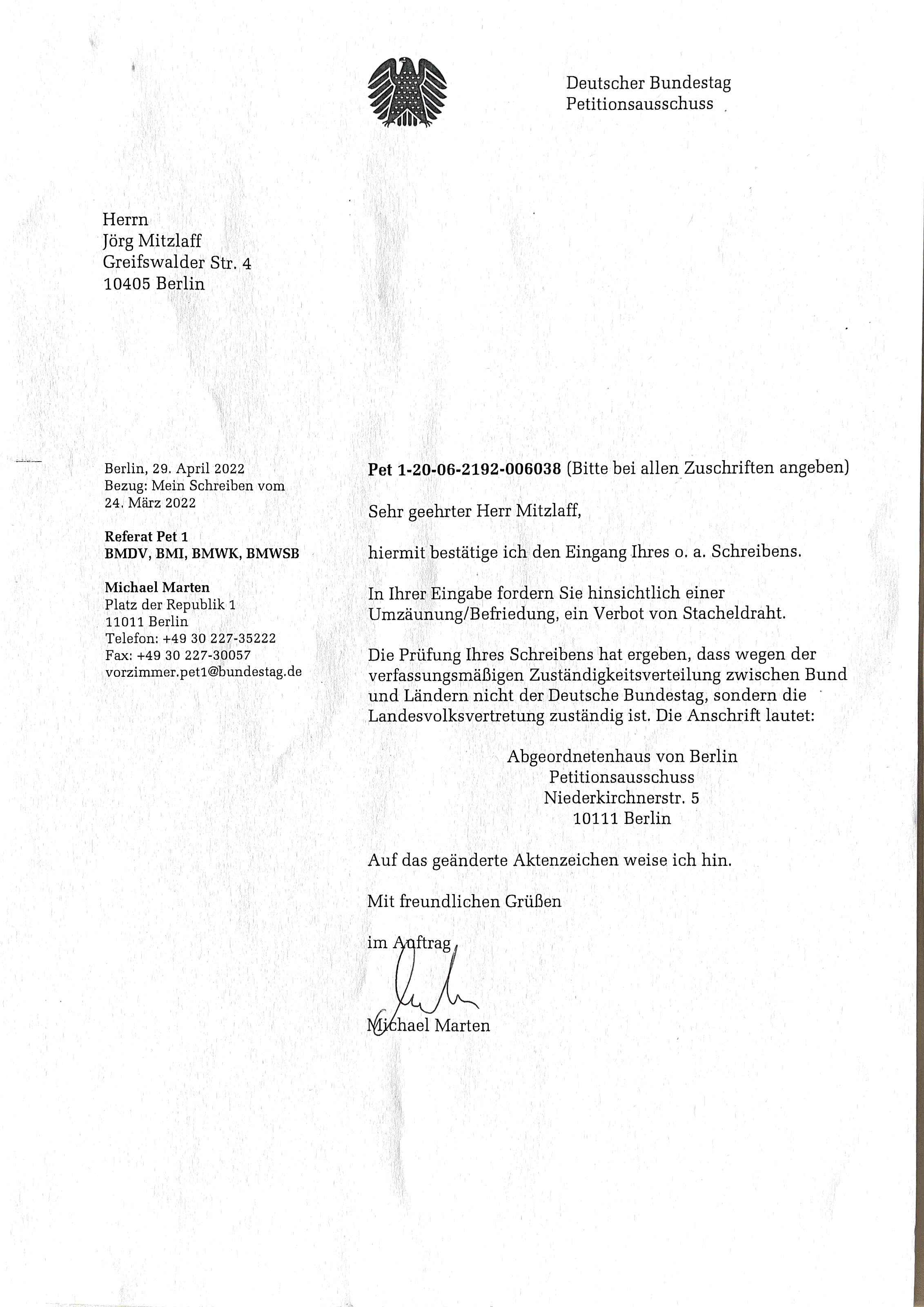 das Anliegen wurde an den zuständigen Petitionsausschuss weitergeleitet und hat das Geschäftszeichen Pet 1-20-06-2192-006038 erhalten. Wir werden Sie auf dem Laufenden halten und regelmäßig über Neuigkeiten informieren.