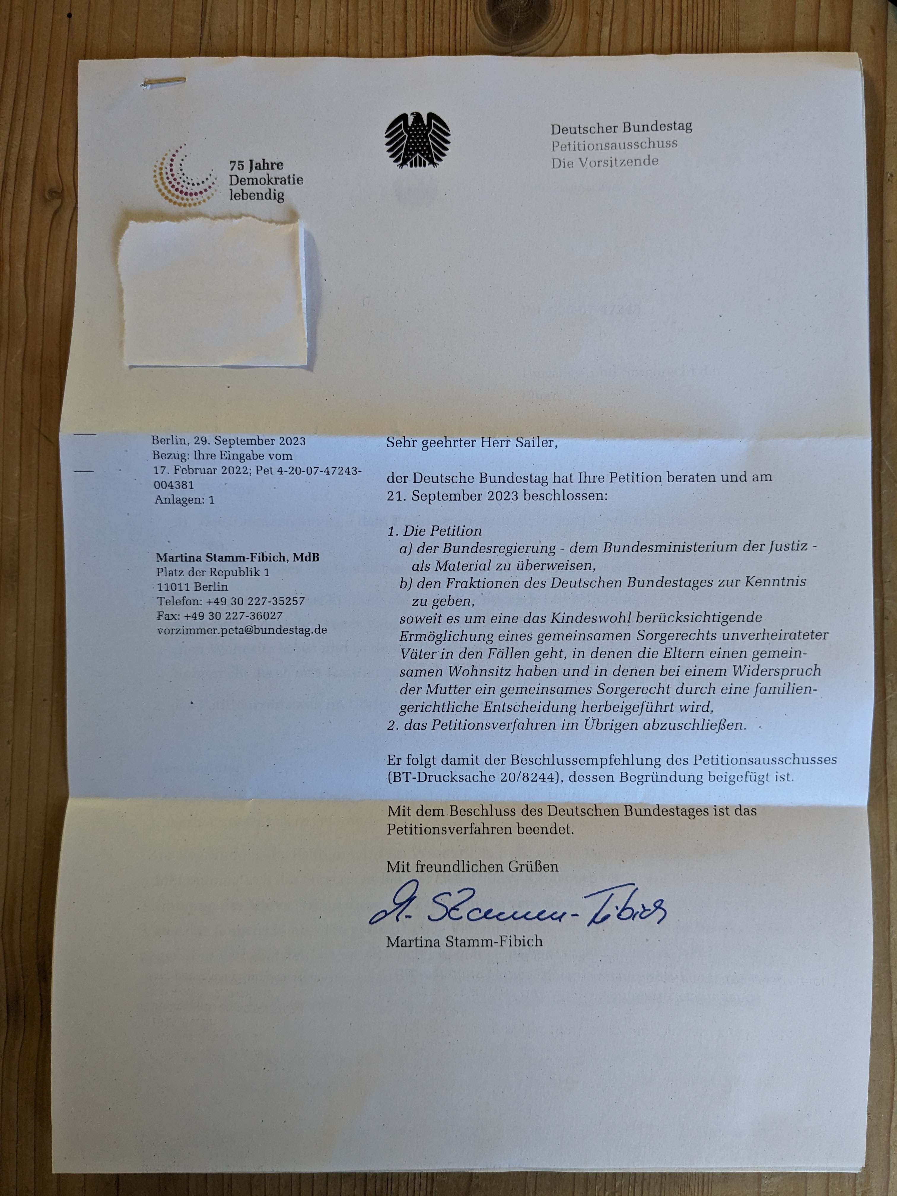 Nachricht zu einer abgeschlossenen Petition 2023-10-06 06:12 Liebe Unterstützende, ich danke allen für die Unterzeichnung meiner Petition! Sie hat im Bundestag Anklang gefunden (siehe beigefügtes Foto). Christian Sailer
