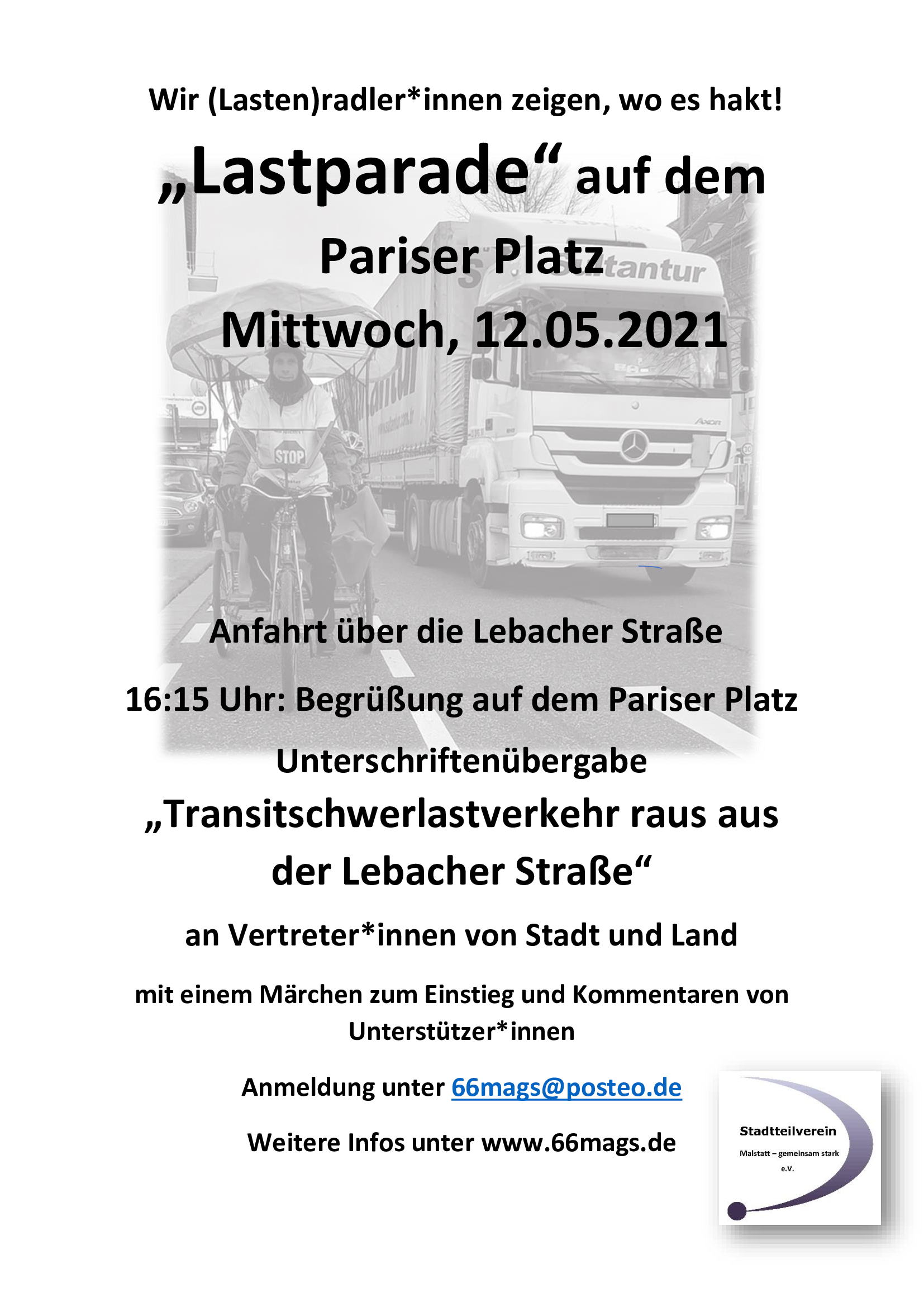 Kommt ab 16 Uhr an den Pariser Platz. sodass wir eine angemessene Kulisse für die Unterschriftenübergabe darstellen. Die Fahrradfahrer*innen unter euch dürfen/sollen/können mit der Lastparade ein paar Runden über die Lebacher Straße fahren!