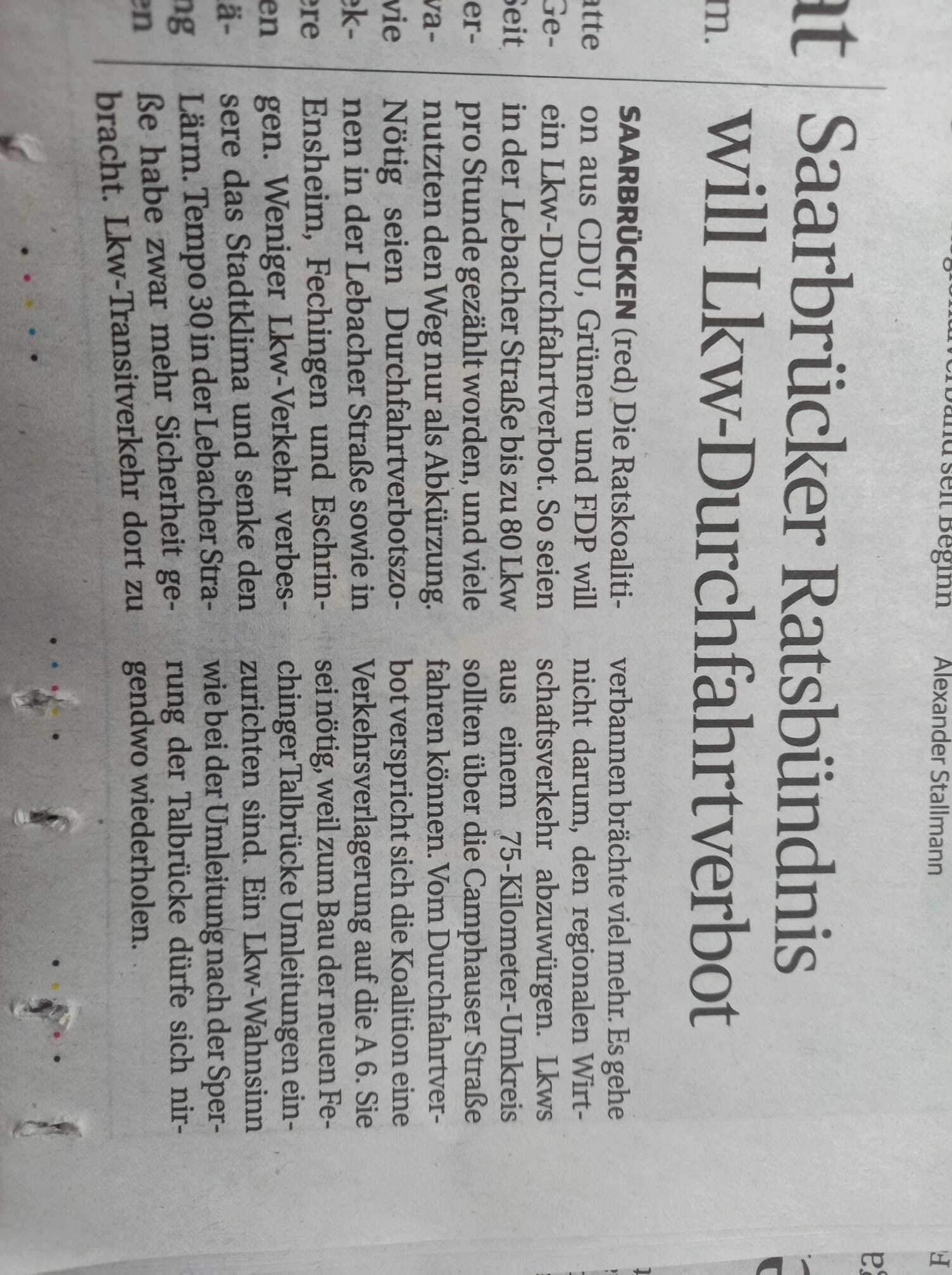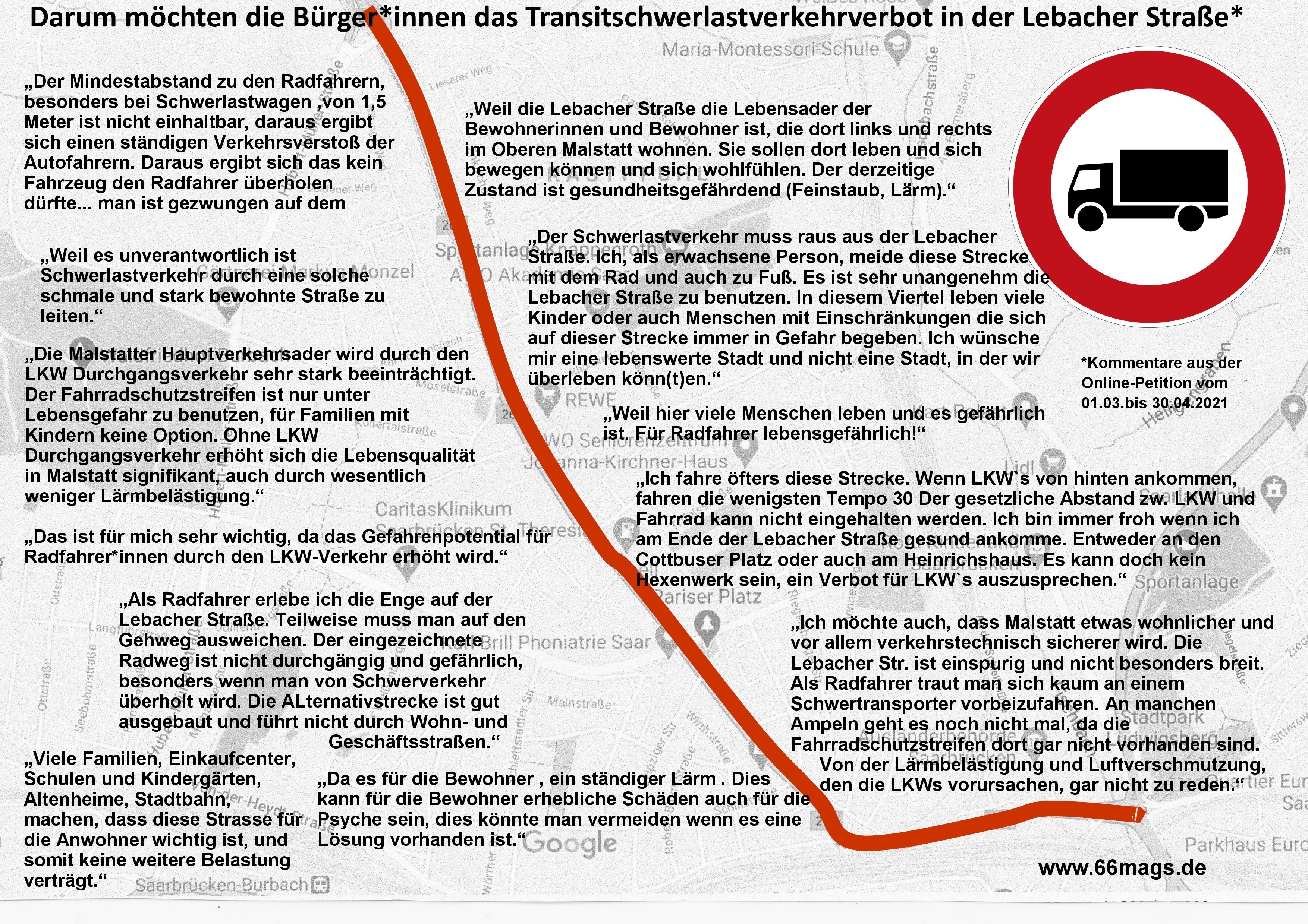 Liebe Unterstützer*innen des Transit-Schwerlastverbotes in der Lebacher Straße. Wir haben mal stichwortartig Ihre und Eure Argumente zusammengetragen.