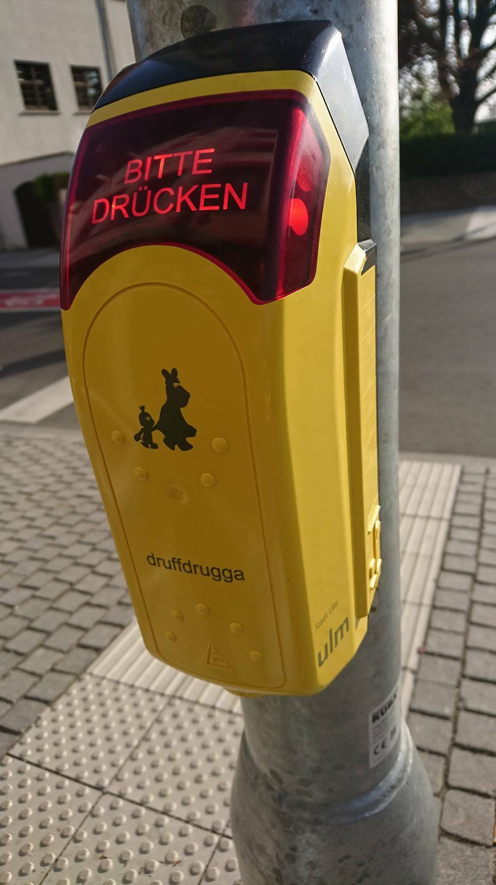 Im Museum steht sie schon, auch in der Garage eines Fans auf der Schwäbischen Alb, nur leider (noch) nicht im Straßenverkehr: die Äffle & Pferdle-Ampel! Nun können wir vom Pferdle & Äffle-Club aber einen Teilerfolg vermelden. Was Stuttgart (noch) nicht schafft, hat Ulm hinbekommen. Dort gibt es an der Herdbrücke "unsere" Ampel wenigstens teilweise. An der Ampel in der Herdbruckerstraße/Donaustraße wurden Ampeltaster mit Äffle & Pferdle und dem Wort "Druffdrugga" installiert. Ein Äffle & Pferdle-Fan entdeckte sie, machte ein Foto davon und schickte es uns. Wir konnten es zuerst nicht glauben, hielten es für einen Scherz, eine Fotomontage oder für eine Nacht-und-Nebel-Aktion eines Fans.