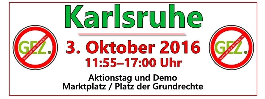 Am Montag, den 3. Oktober, findet von 11.55 Uhr bis 17 Uhr ein Aktionstag mit Demonstration gegen den Zwangs-Rundfunkbeitrag in Karlsruhe statt.