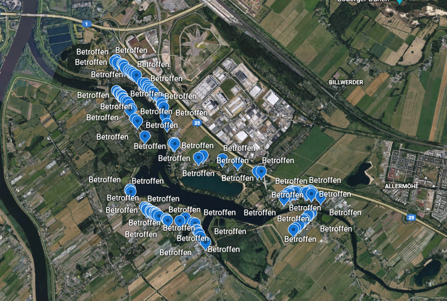Eine erste Analyse ergab, dass zwischen der Brücke bei der Kirche Allermöhe Reitbrook und der Tatenberger-Schleuse mindestens 122 Häuser betroffen sind. Teilweise befinden sich Häuser im Deichgrund grade im Bau!
