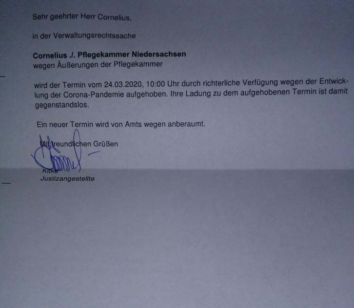 Bedingt durch die Aktuelle Corona-Kriese, habe ich heute beschlossen, den Gerichtstermin am 24.03.2020 gegen die Pflegekammer Niedersachsen zu verschieben.