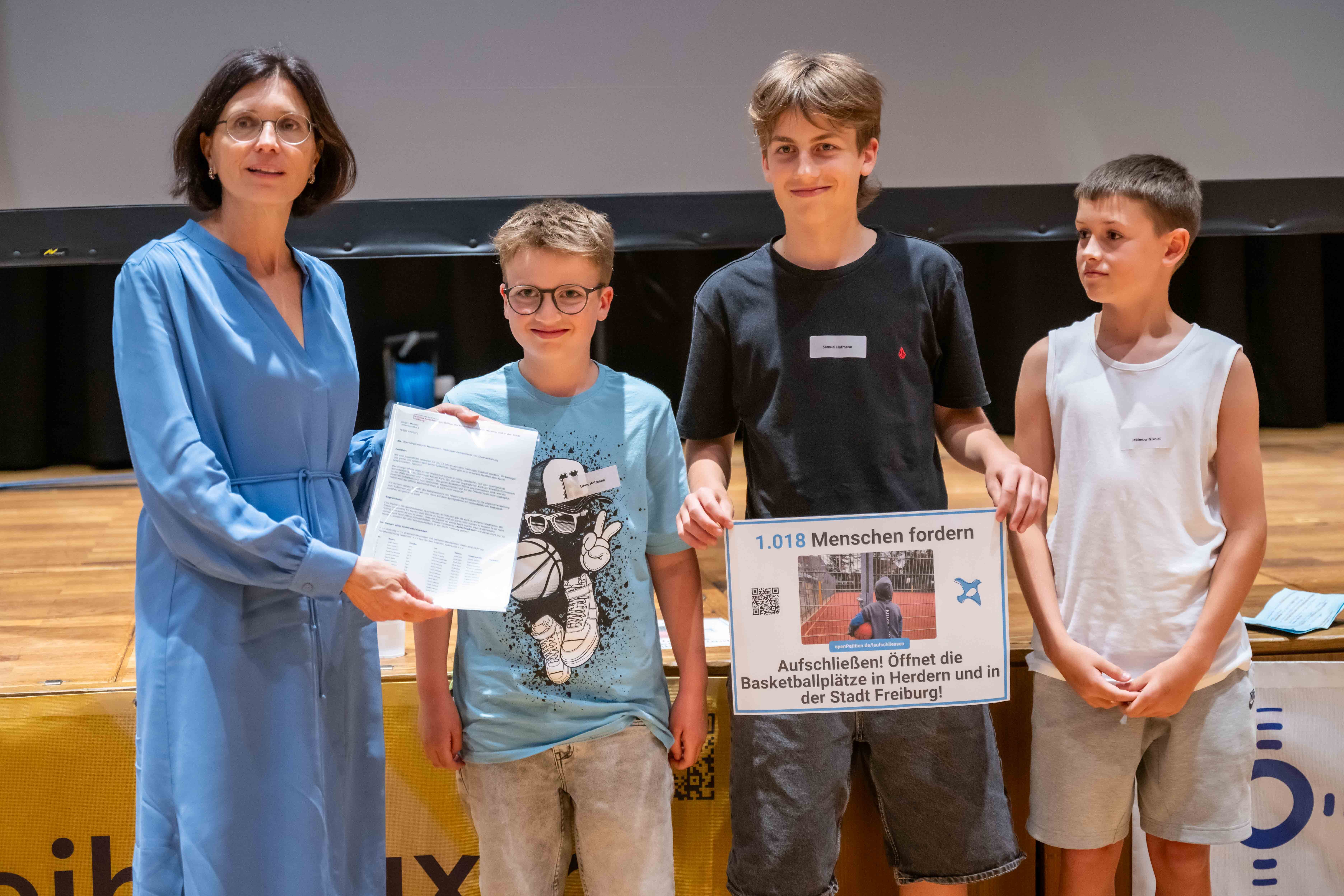 Über 1000 Unterschriften unter ihre Petition haben Linus, Nikolai und Samuel beim Freiburger Jugendforum am 27. Juni an Bürgermeisterin Buchheit übergeben. Etwa hundert Jugendliche und die anwesenden Gemeinderäte und Gemeinderätinnen klatschten zustimmend und begeistert Beifall zu den vorgetragenen Argumenten für die Öffnung von Schulsportplätzen.