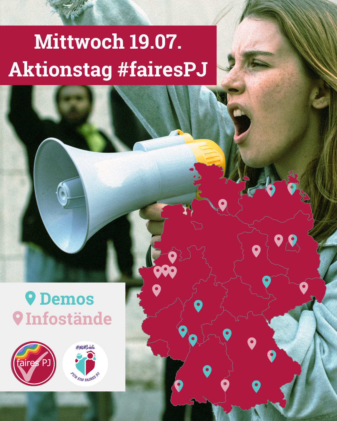 vielen Dank für eure bisherige tatkräftige Unterstützung! Jetzt ziehen wir auf die Straße: Übermorgen wollen wir mit Ihnen und euch im Rahmen unseres Aktionstags für ein #fairesPJ demonstrieren gehen und noch mehr Aufmerksamkeit schaffen: