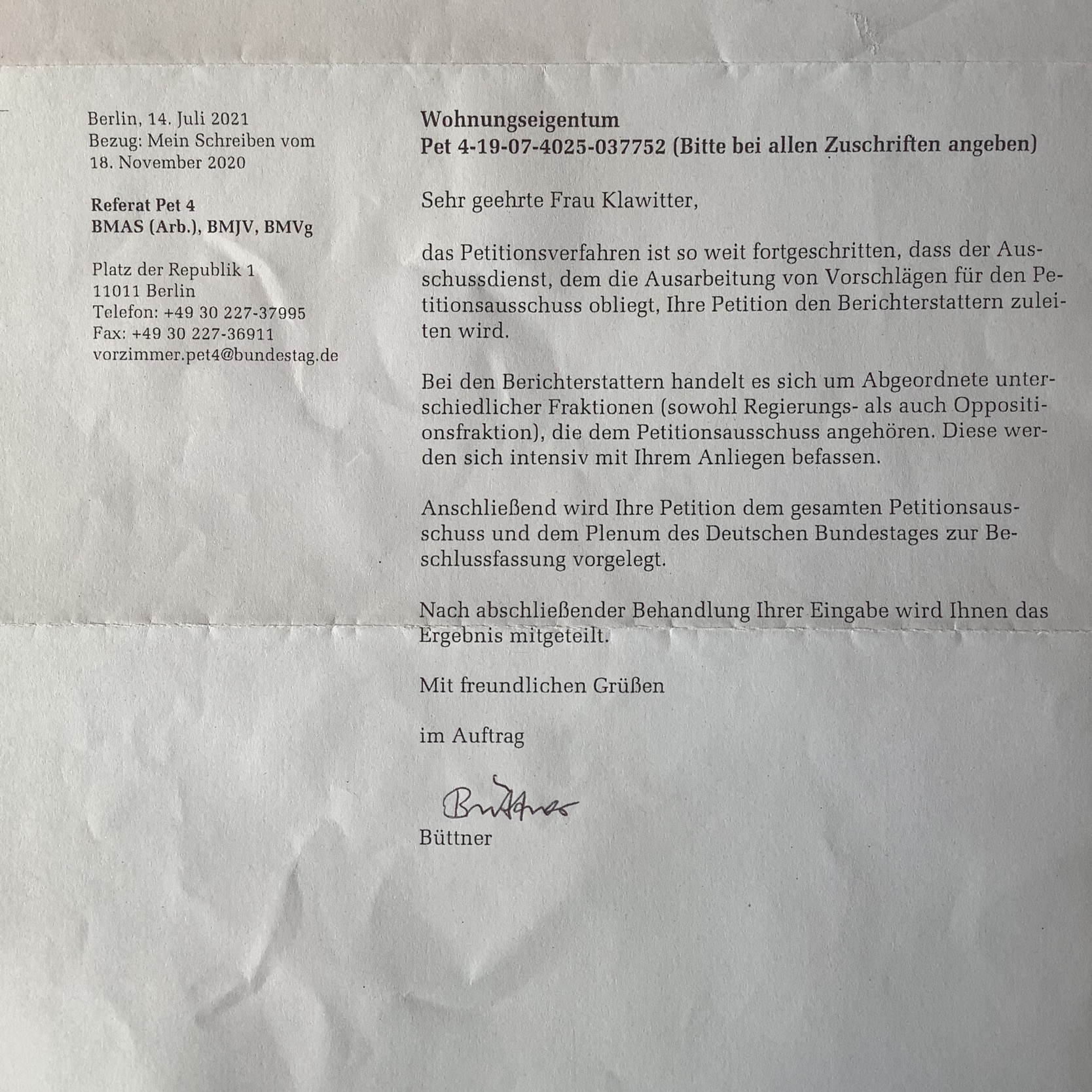 Die Petition wird nun im Petitionsausschuss und im Bundestag diskutiert. Vielleicht haben Sie die Möglichkeit, den Diskussionsprozess online zu verfolgen.