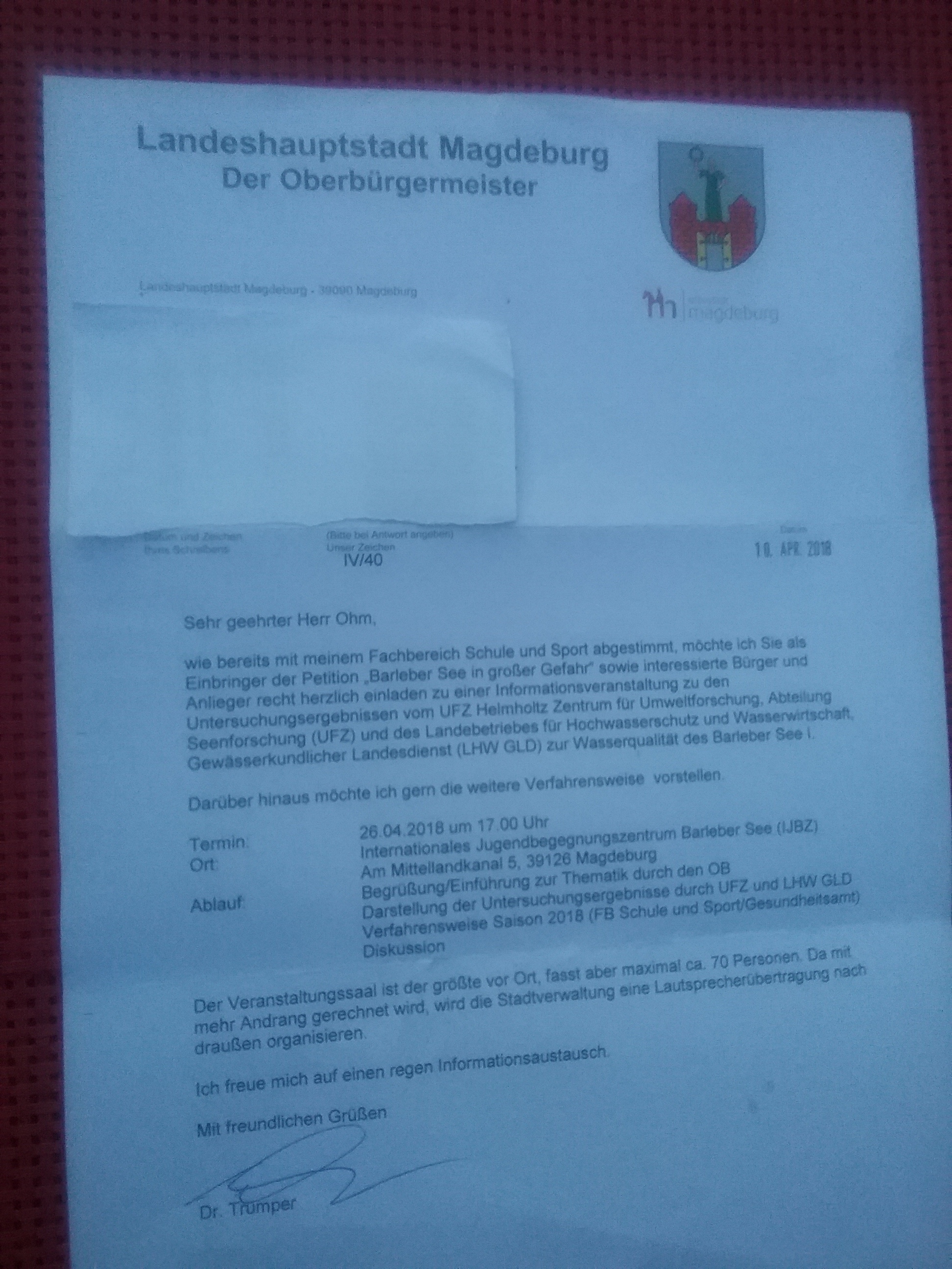 Liebe Unterstützer, der OB kommt an den See, um uns die Analyse vom Helmholzzentrum mitzuteilen und uns die weitere Verfahrensweise vorzustellen. Seien Sie am Donnerstag, 26.04.18, 17 Uhr, Internationale Jugendbegegnungszentrum Barleber See, Am Mittellandkanal 5, 39126 Magdeburg, mit dabei! Zeigen