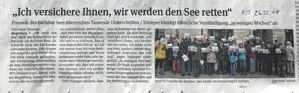 Für Detlef Ohm, Einbringer der Petition „Barleber See in großer Gefahr“, ist der Besuch des Oberbürgermeisters und die Infoveranstaltung ein Erfolg. „Damit sind wir wieder dem Petitionsziel ein großes Stück näher gekommen“, erklärt er. 4773 Unterstützer, davon 3079 aus Magdeburg, gab es für die von Ohm initierte Onlinepetition. Im Februar wurden die Unterschriften auf der Stadtratssitzung an OB Trümper übergeben. „Wir dürfen gespannt sein, welche weiteren Schritte zur Verbesserung der Wasserqualität von der Stadt geplant werden, damit das ‚blaue Auge‘ erhalten bleibt“, erklärt er.