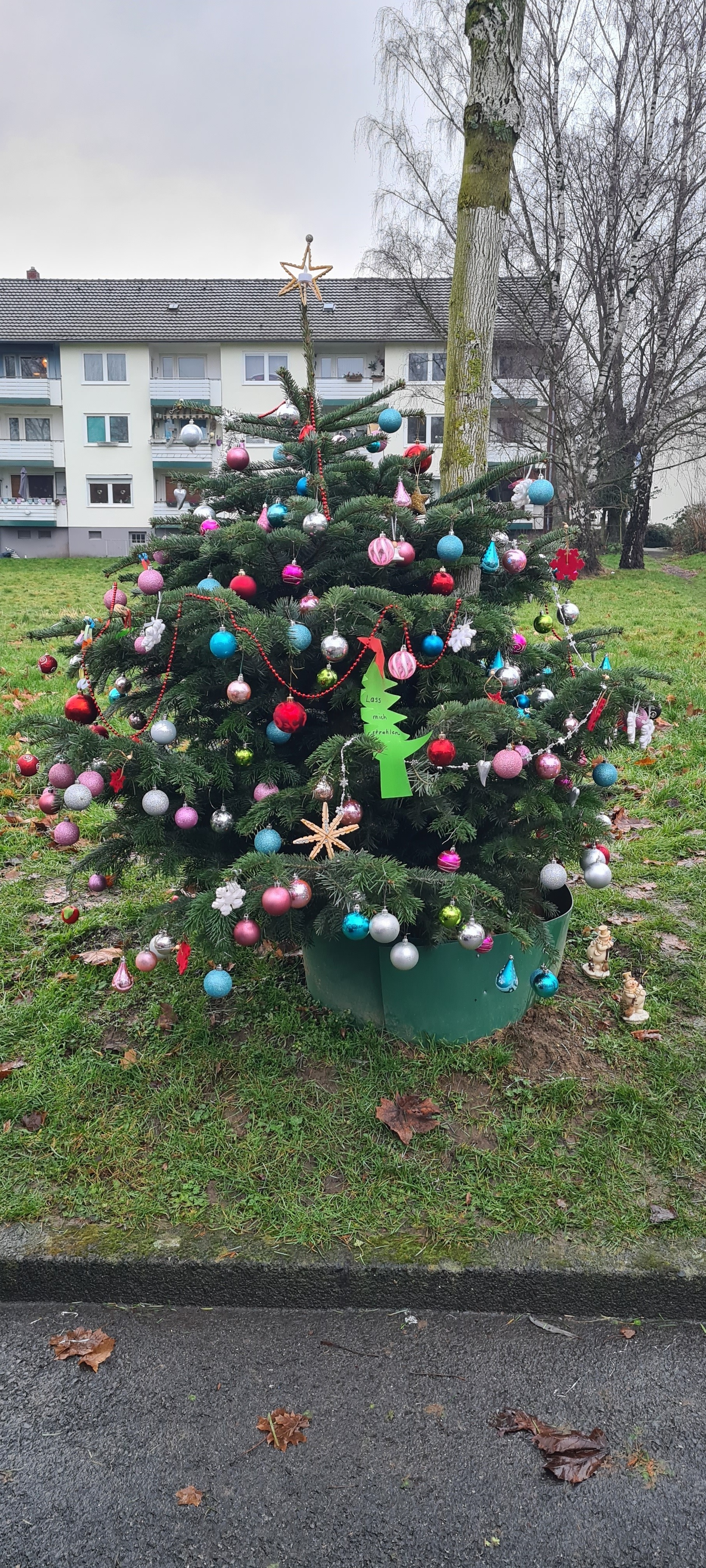 Wir stellten einen Weihnachtsbaum mit dem Hinweis "lasst mich erstrahlen" auf.