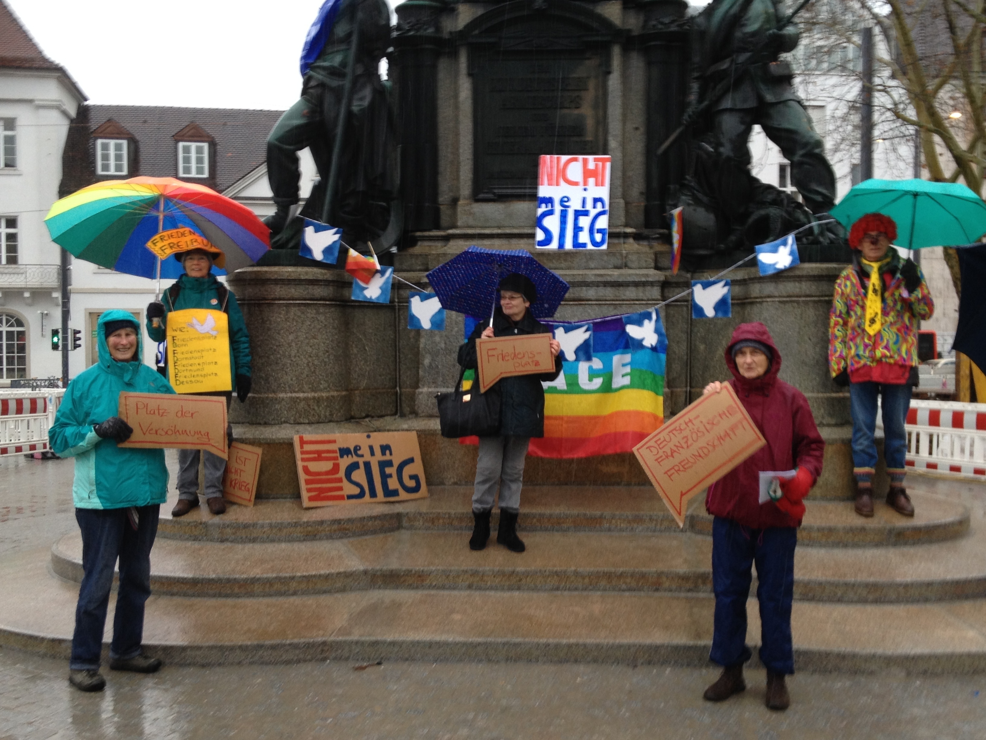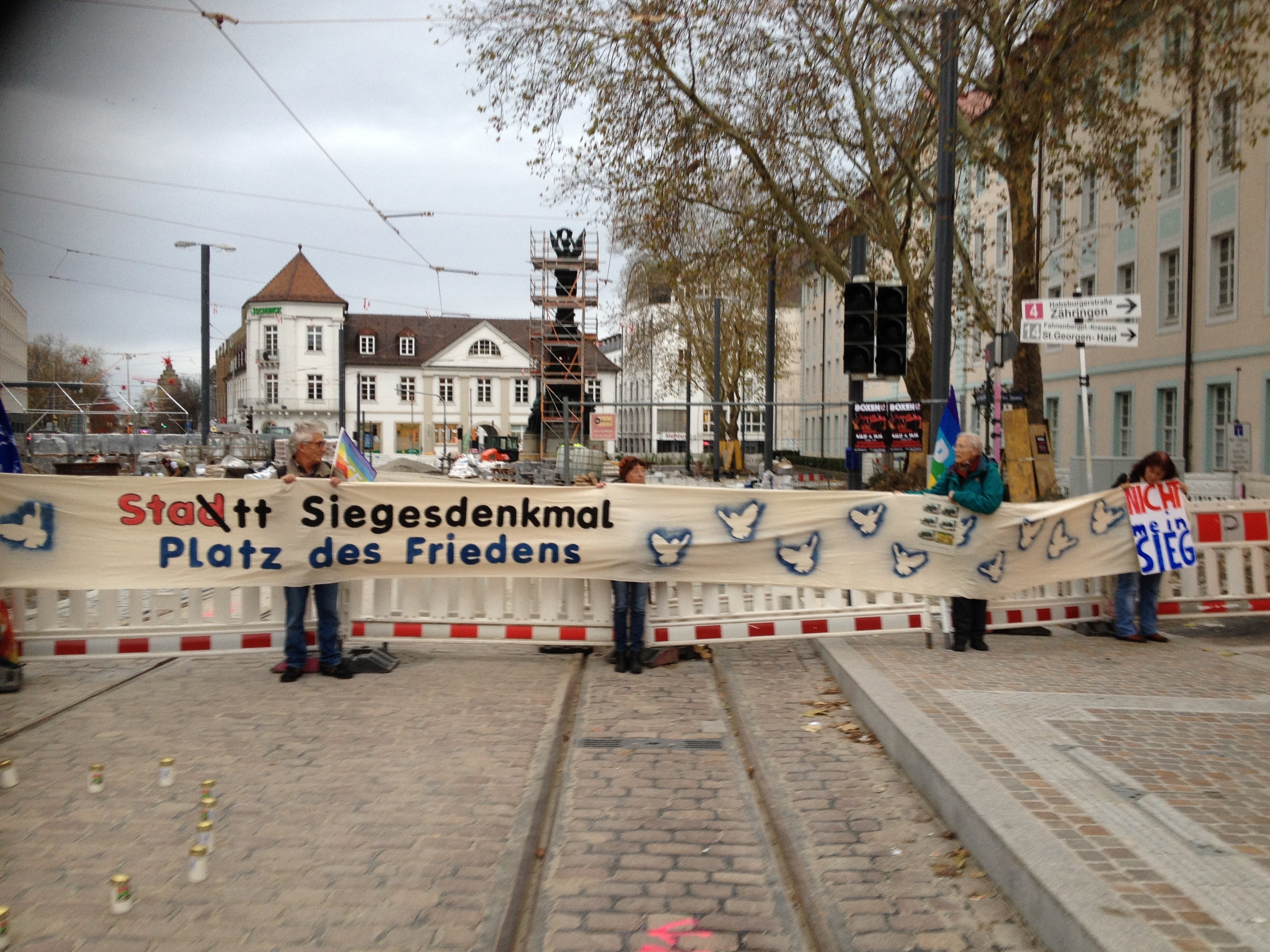 der Platz um das wieder aufgestellte Denkmal des Sieges im Jahr 1871 über französische Soldaten hat bis heute formal keinen Namen, sondern war zuletzt nur mit der Straßenbahnhaltestelle "Siegesdenkmal“ verbunden. Durch unsere Initiative wollen wir das ändern und nun kurzfristig vor der nächsten Gemeinderatssitzung am Dienstag 28.11.17, in der unseres Wissens nach darüber gesprochen werden soll, eine Mahnwache abhalten und weitere UnterstützerInnen für einen Namen finden. Wir bitten deshalb um eure Unterstützung!