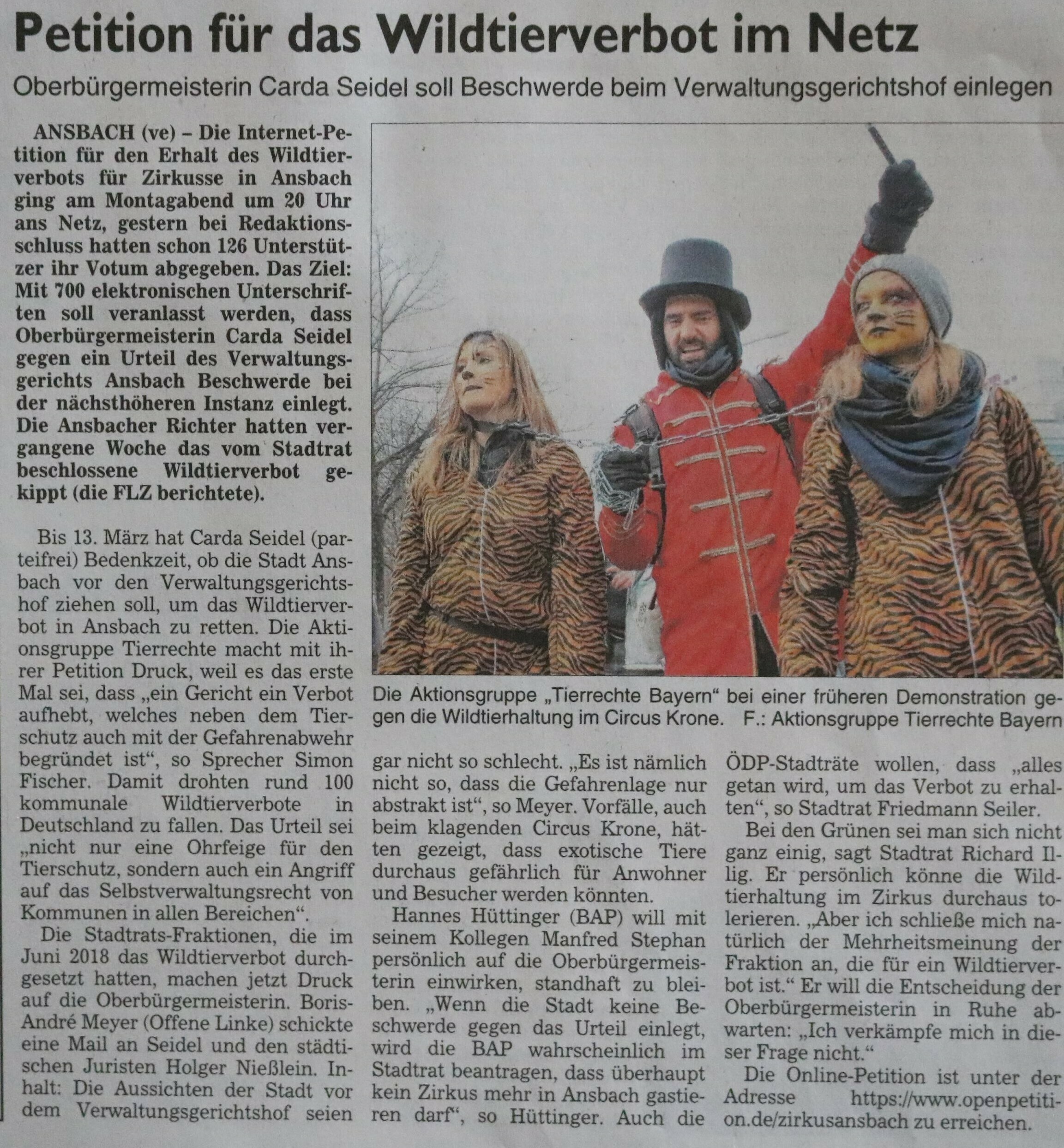 vielen Dank für eure Beteiligung. Innerhalb weniger Stunden sind schon über 100 Unterschriften aus Ansbach und zahlreiche weitere Unterschriften aus ganz Deutschland zusammengekommen. Der aktuelle Stand sind 228 Unterschriften aus Ansbach und 781 Unterschriften bundesweit. Damit haben wir 33% unseres Ziels, 700 Unterschriften aus der Stadt Ansbach, erreicht. Heute berichtet die FLZ in der Lokalausgabe über den Start der Petition. Zahlreiche Parteien aus dem Stadtrat stehen hinter dem Wildtierverbot und fordern ebenfalls von der OB Seidel, dass sie gegen das Urteil Beschwerde einlegt.