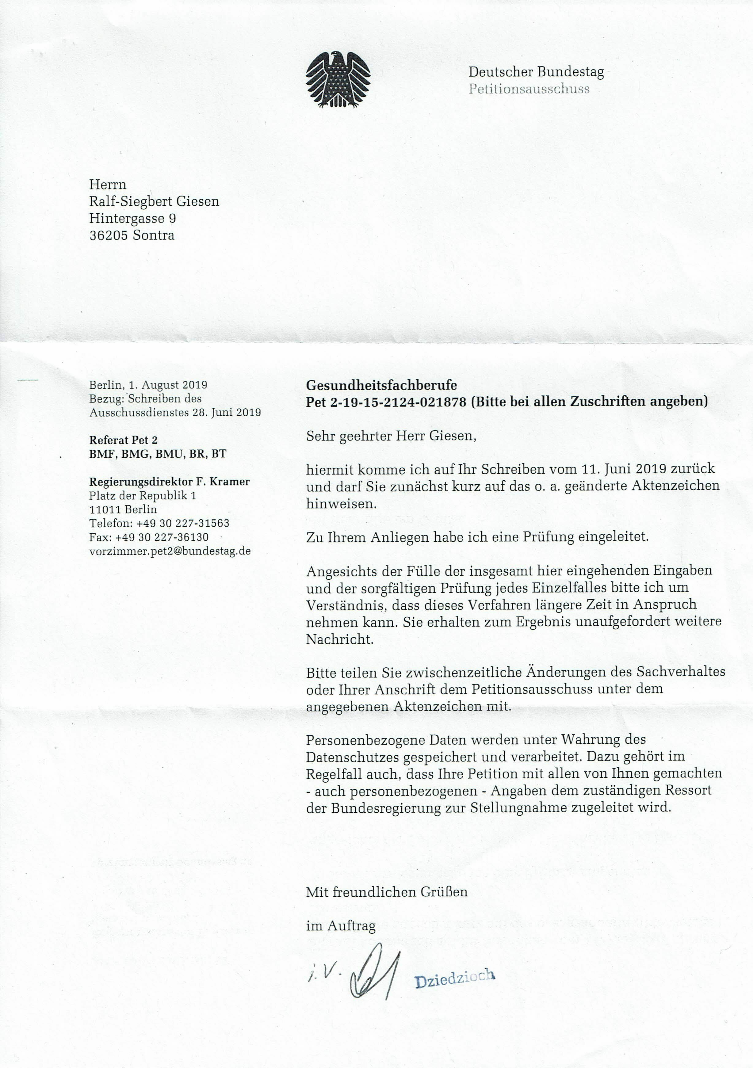 Die Petition befindet sich in der Prüfung beim Empfänger 2019. 08. 11. 10:10 Im landtag sowie im Bundestag soll die Petition gelesen werden.