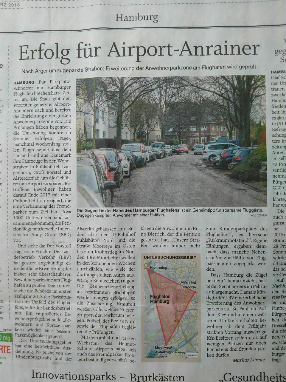 wir haben es geschafft: Das Hamburger Abendblatt meldet heute die Einrichtung aller 5 Bewohnerparkzonen rund um Fuhlsbüttel per 17. Juni 2019. Der Text des Artikels findet sich als PDF in der Anlage.