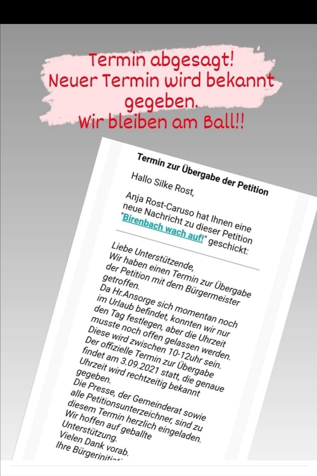 Leider musste der Termin zur Übergabe der Petition am 3.09.2021 mit dem Bürgermeister Hr.Ansorge abgesagt werden.