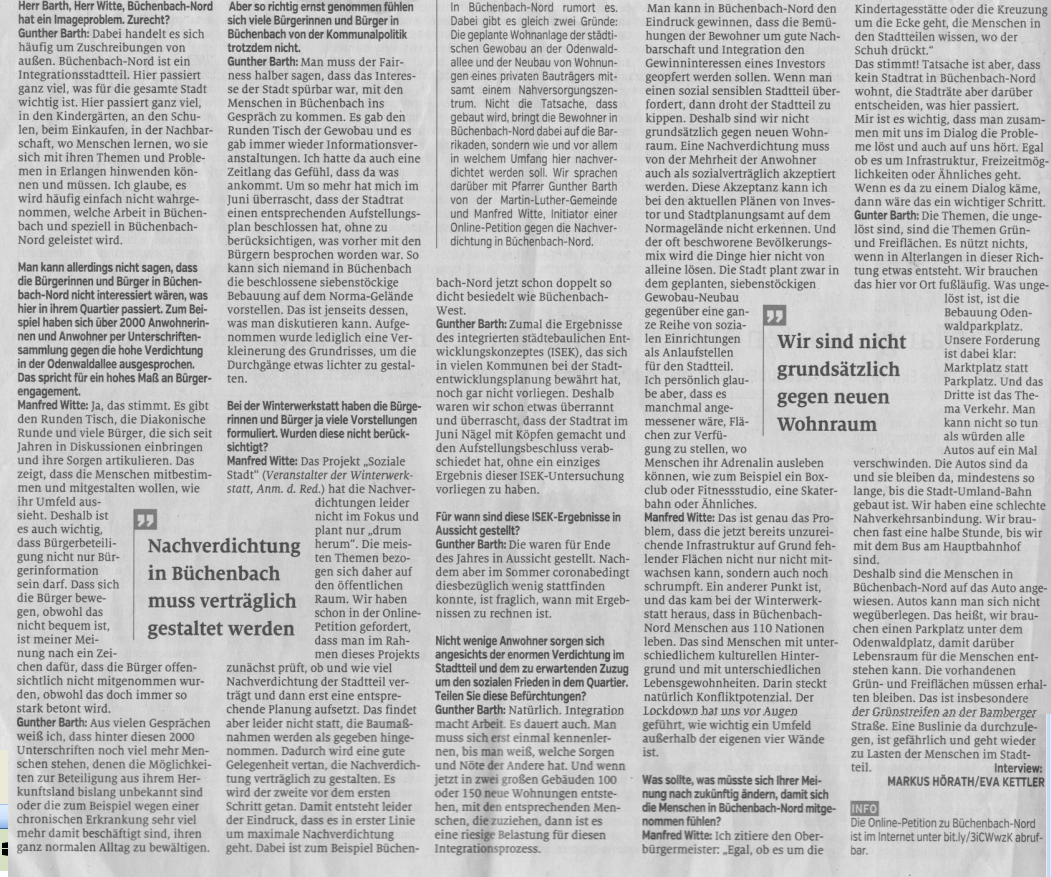 Im Oktober erschien ein Interview der Erlanger Nachrichten in eben dieser Zeitung mit Dr. Gunther Barth, Pfarrer der Martin-Luther Gemeinde in Büchenbach, und Manfred Witte, Mitinitiator der Online-Petition.