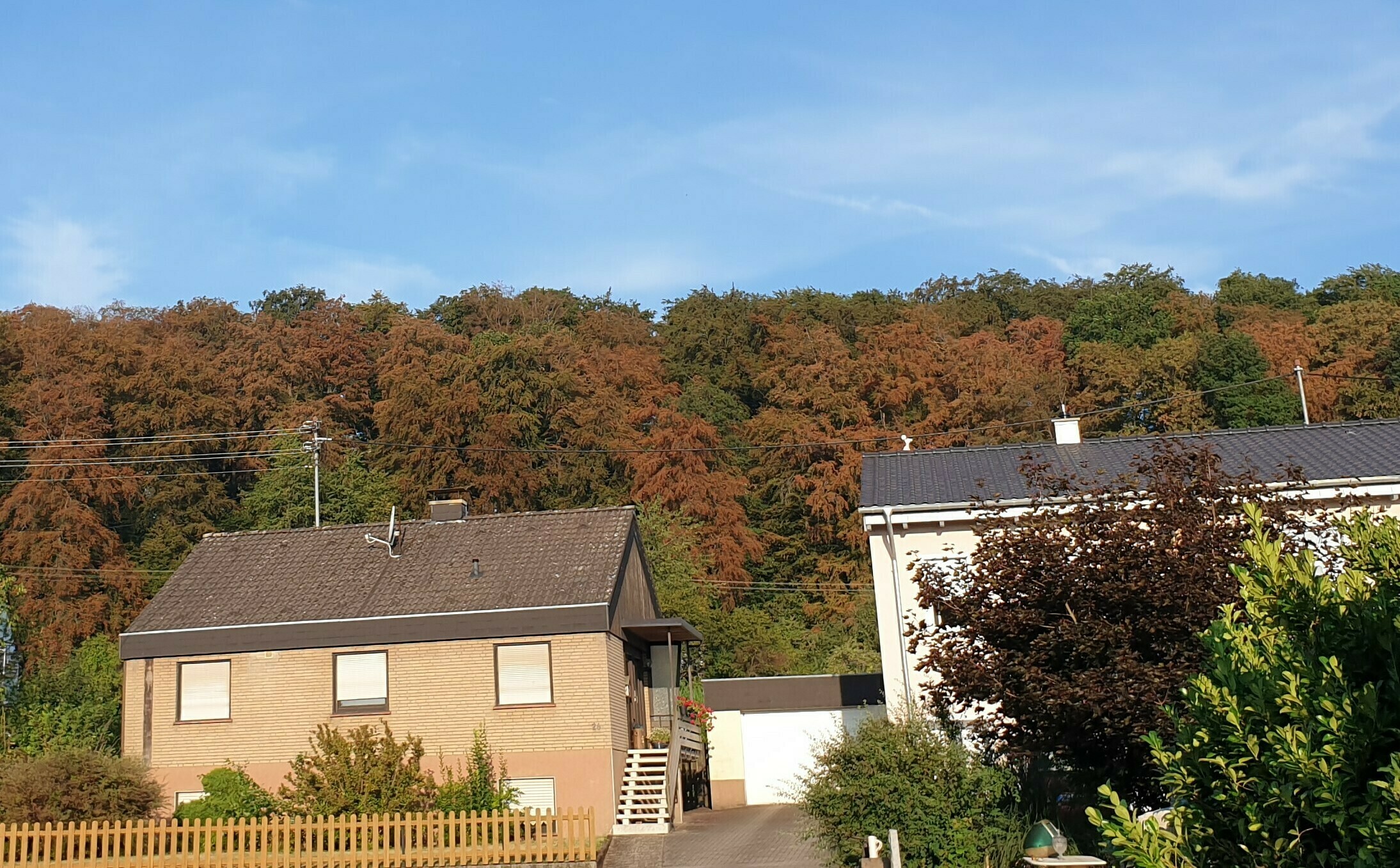 Das Bild zeigt übrigens die weithin sichtbaren Dürreschäden an den Buchen unseres Mecherswaldes, der 2019 durchforstet wurde. Es wurde im Juli aufgenommen, d. h. vor dem Herbstanfang!
