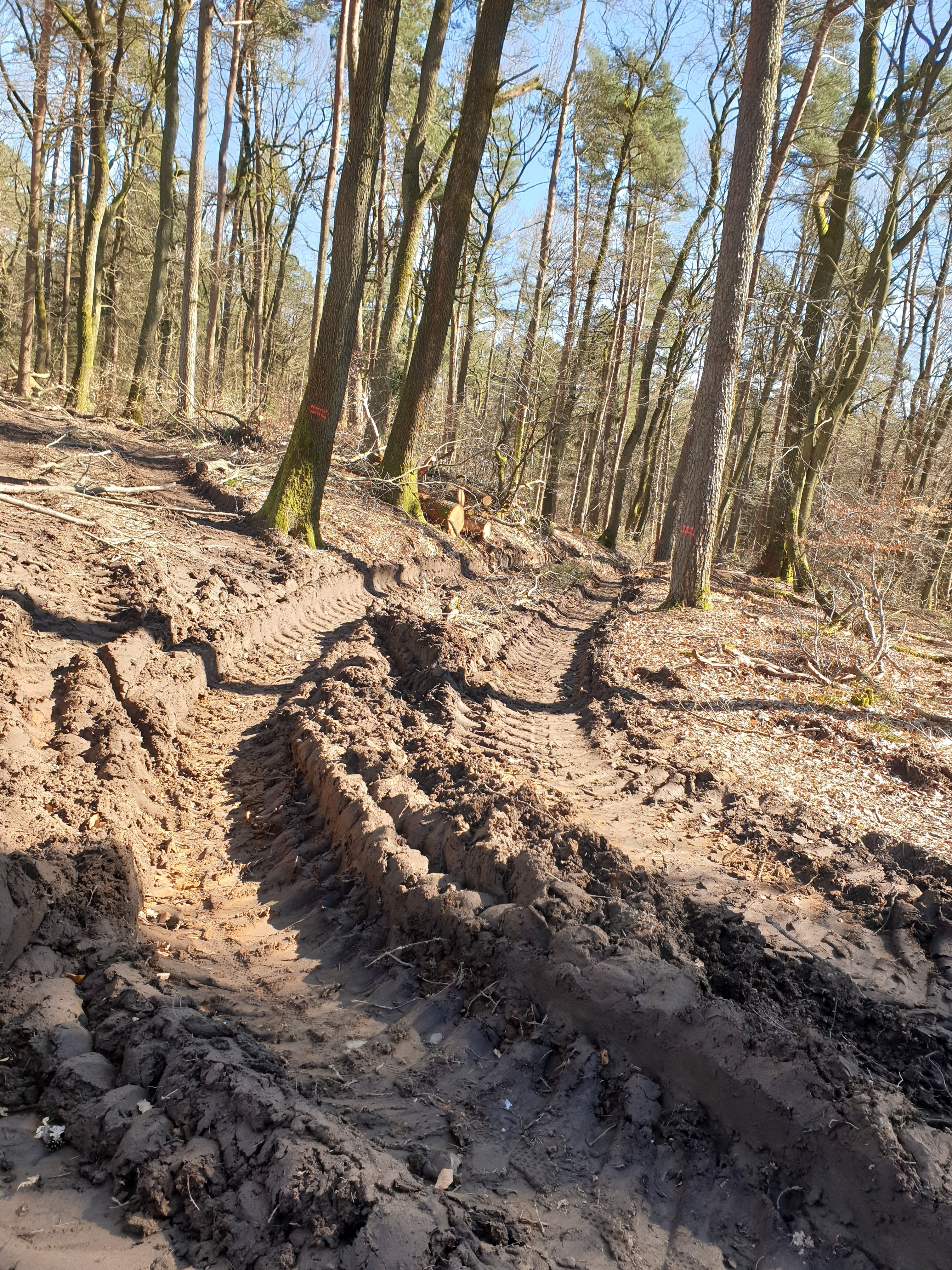 Denn so wie auf dem Originalbild aus dem Mecherswald vom April 2019 sollte es nicht weiter aussehen. Schwere Erntemaschinen haben einen auf Jahre verdichteten Boden und Schäden an gesunden, nicht zu fällenden Bäumen hinterlassen.