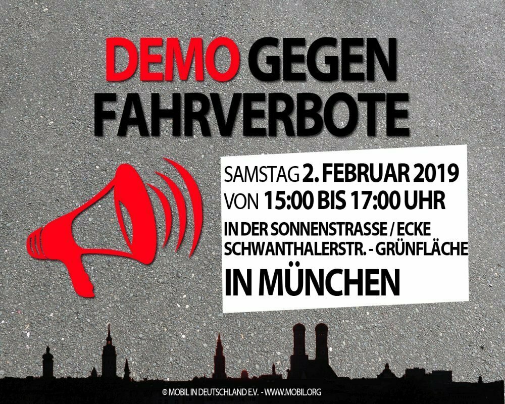 Stuttgart hat es bereits erfolgreich vorgemacht: Am letzten Samstag waren über 2.000 Menschen auf der Straße, um gegen Fahrverbote in der Stadt zu demonstrieren. Jetzt ist München an der Reihe! Auch hier drohen Fahrverbote aufgrund der Klagen der DUH. Der Automobilclub Mobil in Deutschland e.V. veranstaltet daher jetzt die erste offizielle Demonstration gegen Fahrverbote und für Mobilität in der bayerischen Landeshauptstadt und Sie sind herzlich eingeladen!