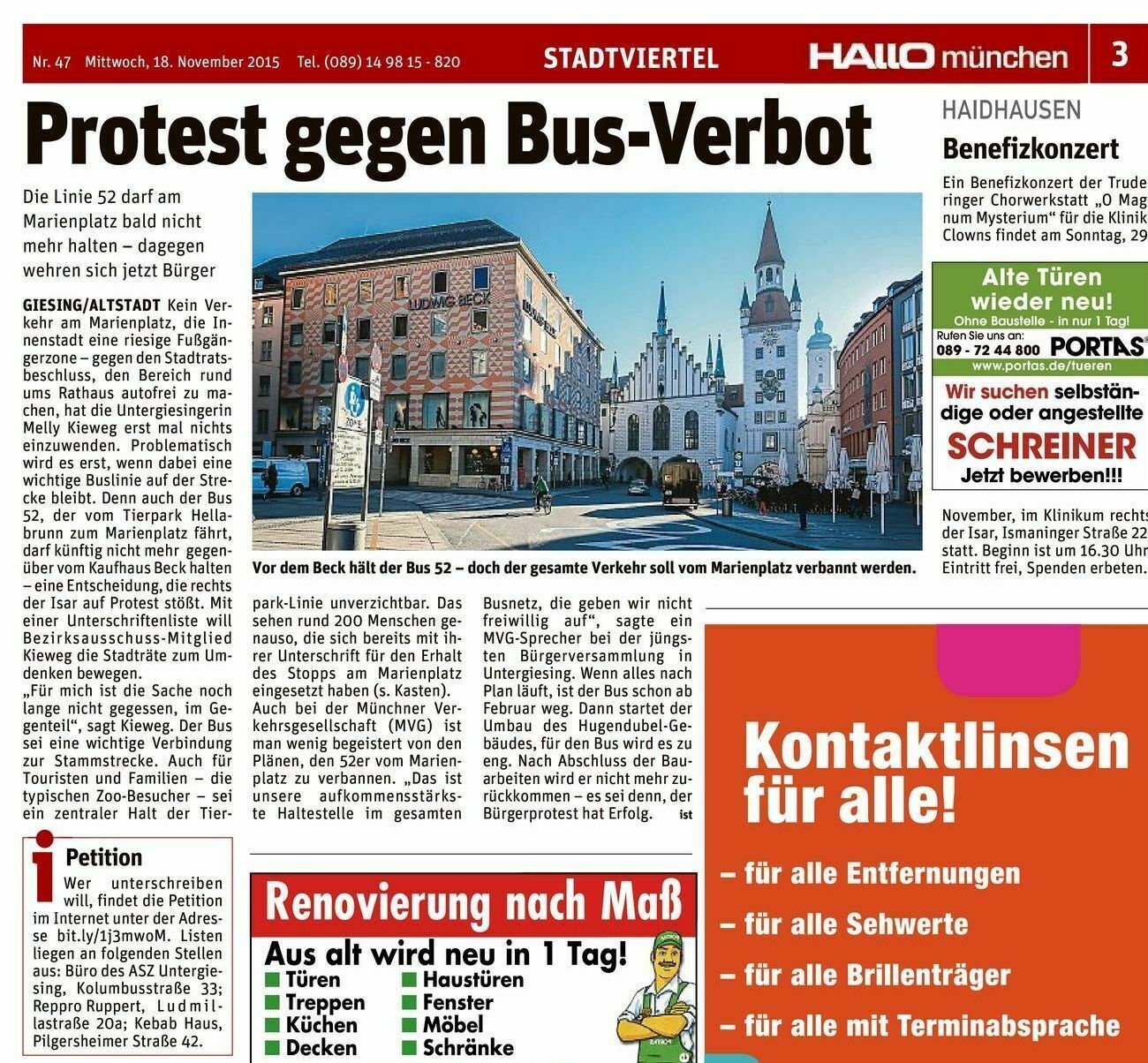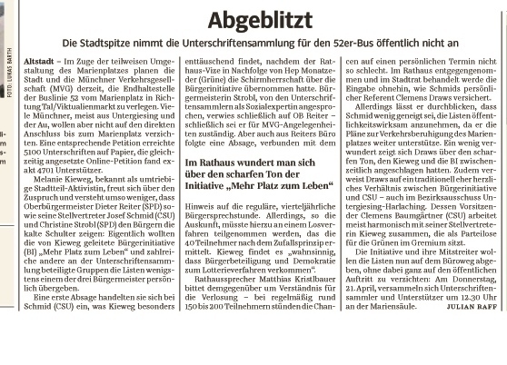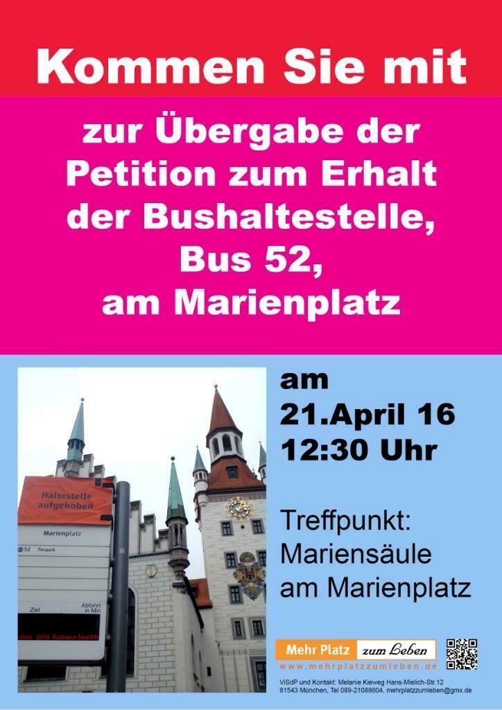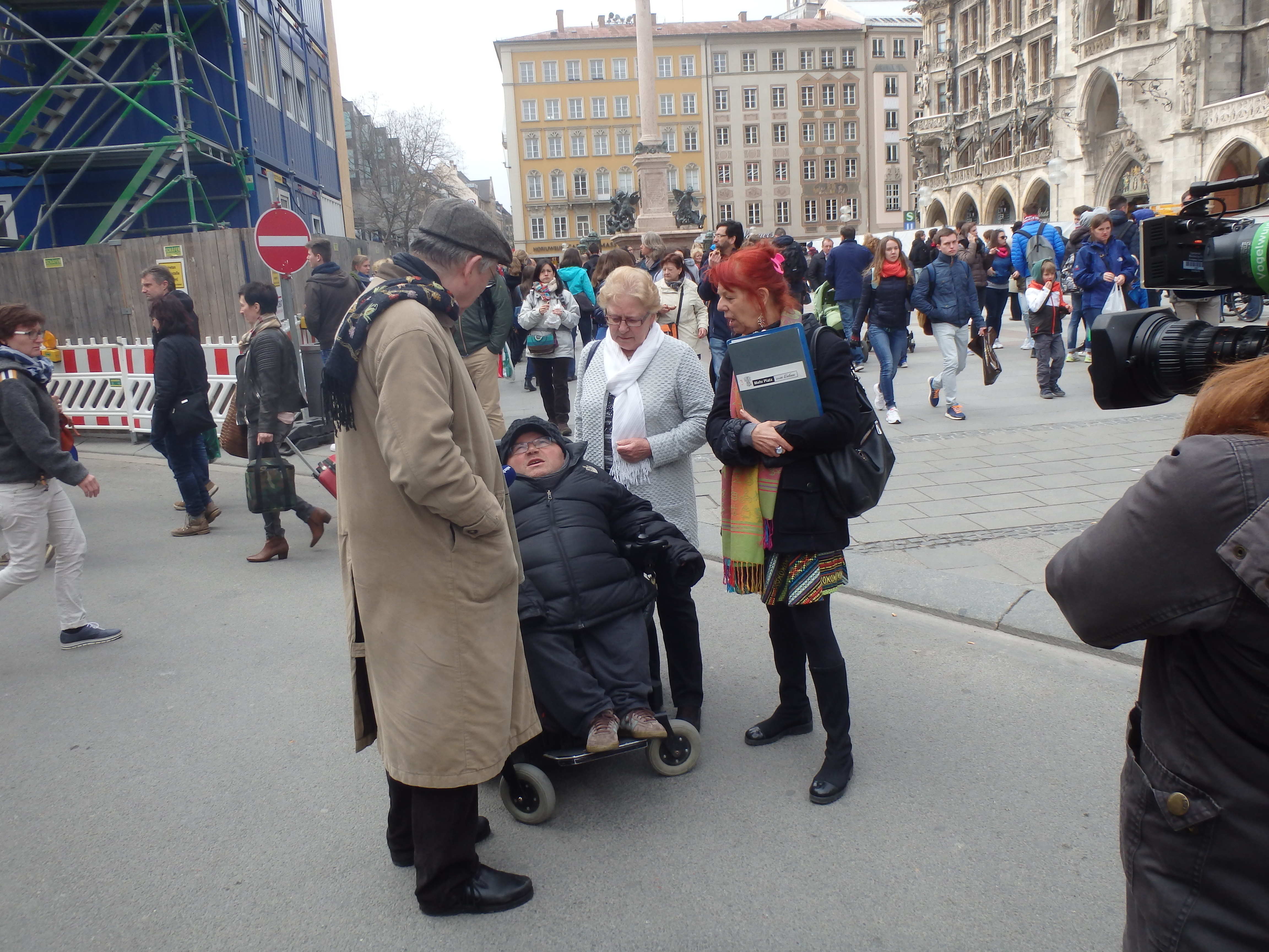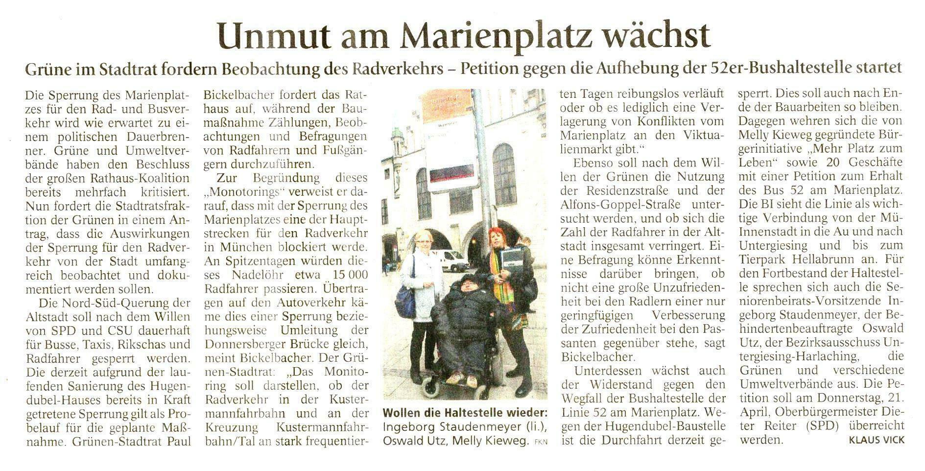 Am 1. April (kein Aprilscherz) Interview am Marienplatz mit TV München Christofer Griebel, Oswald Utz, Ehrenamtlicher Behindertenbeauftragter der LHM, Ingeborg Staudenmeyer, Vorsitzende des Seniorenbeirates der LHM, Melly Kieweg Sprecherin der BI Mehr Platz zum Leben über die Unsinnigkeit der Schließung der Haltestelle am Marienplatz