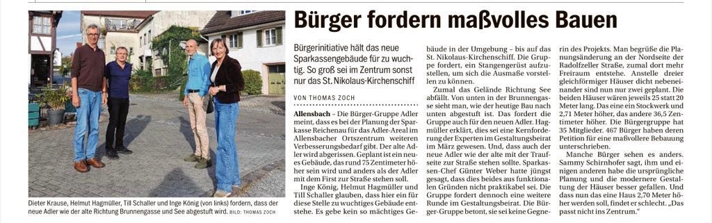 Bei einem Gespräch mit Bürgermeister Friedrich wollen wir darauf drängen und auch eine weitere Einbindung des Gestaltungsbeirats bei dieser so wichtigen Entscheidung für die Allensbacher Ortsmitte anregen.