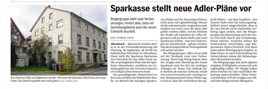 Bürgermeister Friedrich und die Bezirkssparkasse Reichenau laden am Dienstag, 26. September, um 18 Uhr in den Pfarrsaal ein. Sie werden im Rahmen einer öffentlichen Gemeinderatssitzung die neuen Pläne für das Adlerareal vorstellen.