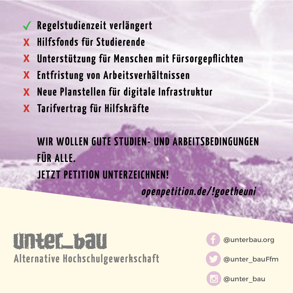 Wir verlängern die Petition noch einmal, weil uns die Auswirkungen der „Corona“-Krise auch im kommenden Wintersemester begleiten werden. Dazu möchten wir gerne mit noch mehr Unterschriften den Entscheidungsträger*innen zeigen, dass sie ihrer Verantwortung nachkommen und gute Bedingungen für alle Statusgruppen an der Hochschule schaffen müssen. Also teilt die Petition nochmal kräftig!