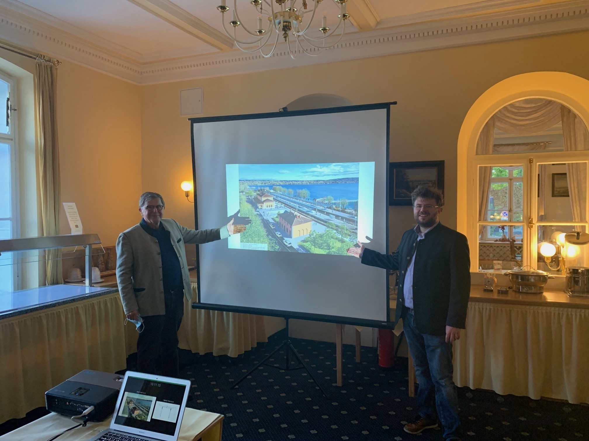 Auf dem beigefügten Bild sehen Sie links Maximilian Ardelt und rechts Stefan W. Zeil vor dem Bild einer wünschenswerten Gestaltung des historischen Starnberger Bürklinbahnhofs.