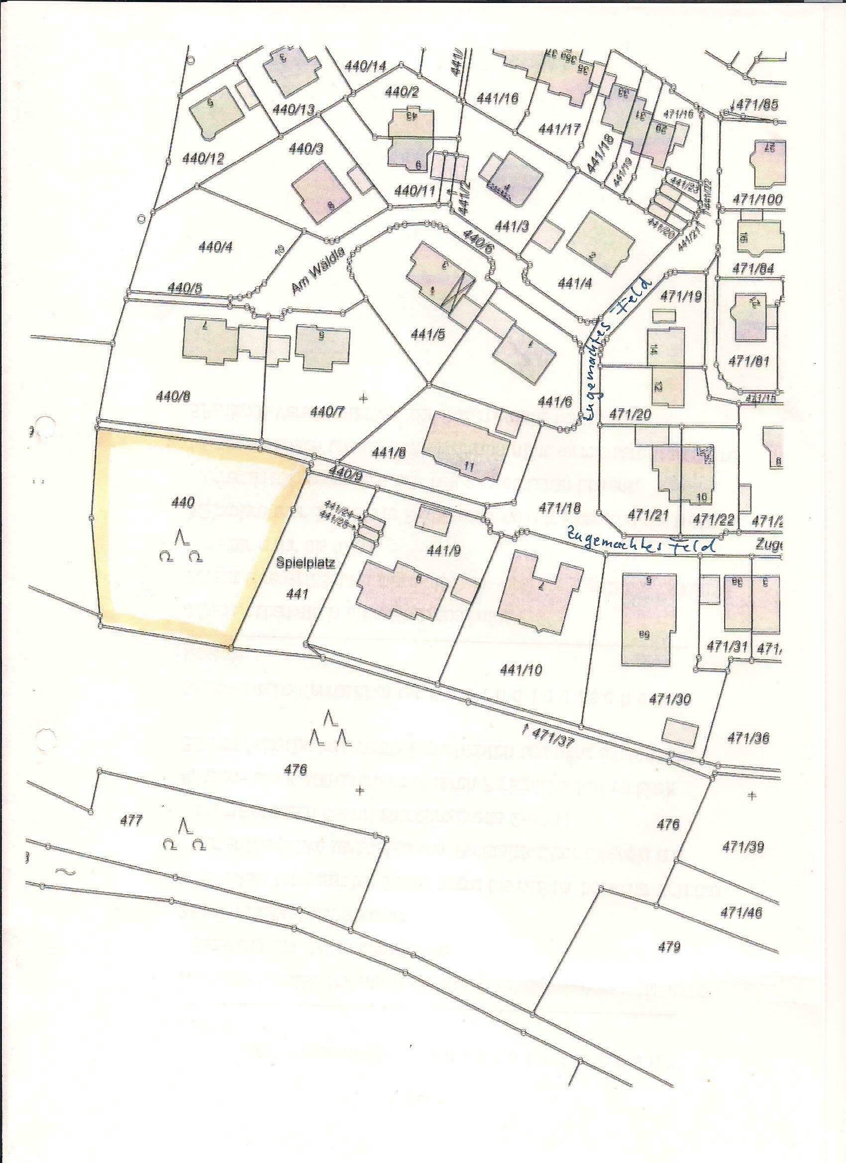 In der Abbildung ist das betroffene Waldstück (Flur Nr. 440) gelb markiert. Direkt angrenzend an den Spielplatz am westlichen Ende der Straße "Zugemachtes Feld" .