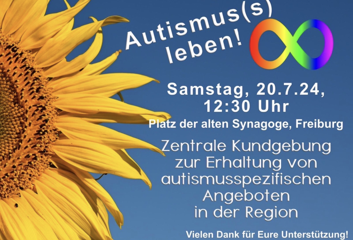 heute (am 20.07.2024) findet um 12:30 Uhr am Platz der Alten Synagoge in Freiburg statt unter dem Motto "Autismus(s) leben!" zum Erhalt autismusspezifischer Angebote in der Region.