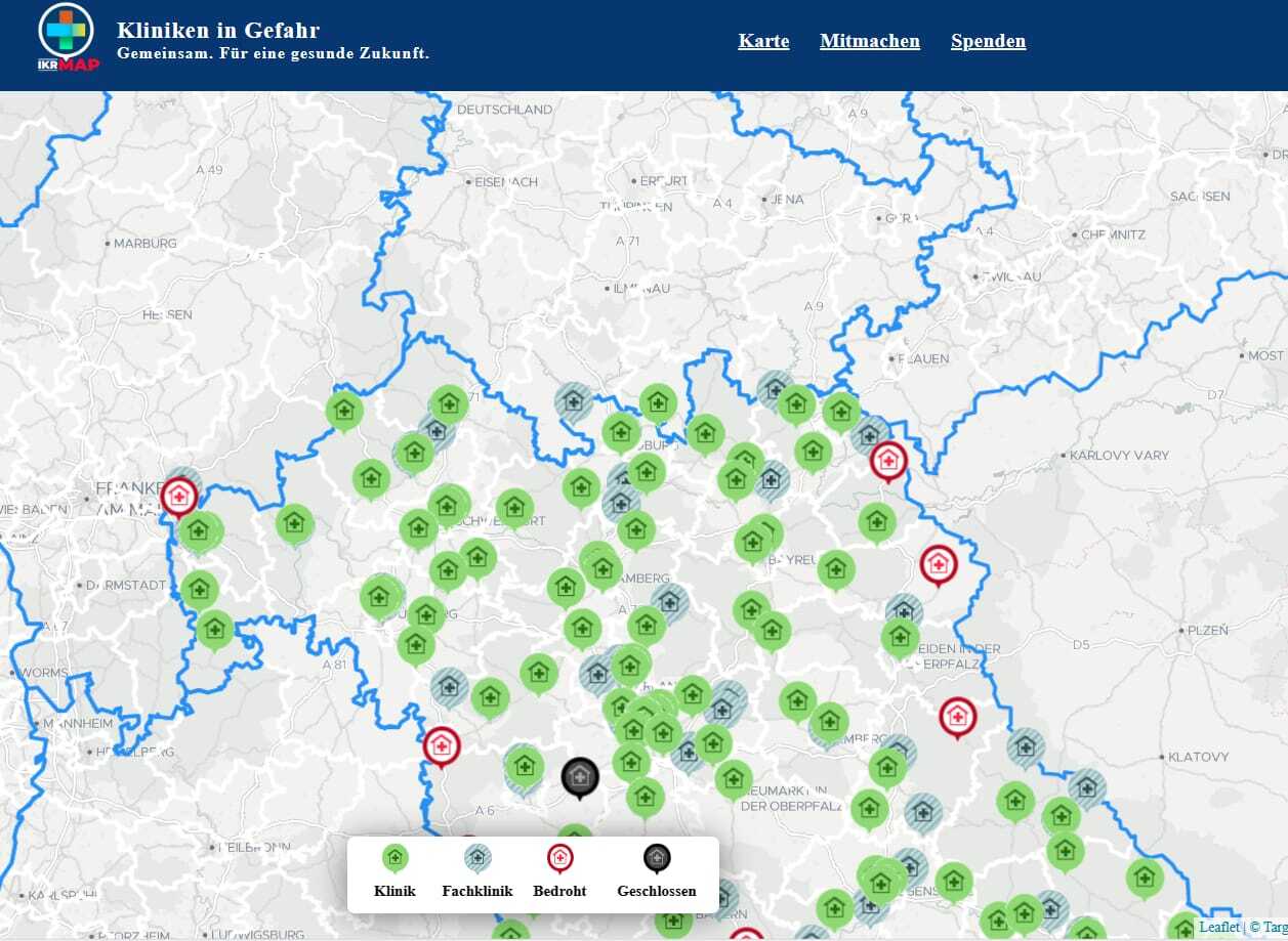 Drohende Komplettschließungen bzw. Insolvenzen: Mainburg, Kösching, Coburg, Neustadt/Coburg, Lichtenfels, Drohende Schließungen der Notaufnahme: Wertheim, Oberstdorf