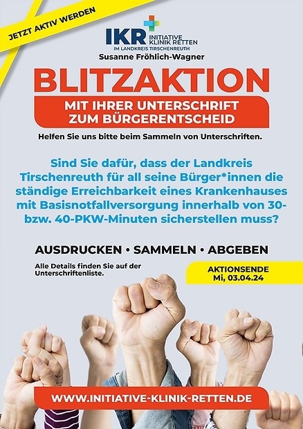 Der Kreistag Tirschenreuth entscheidet am letzten möglichen Tag, am Freitag, 17. Mai, um 13 Uhr über das Bürgerbegehren für eine durchgängige Erreichbarkeit eines Allgemeinkrankenhauses binnen 30 Fahrzeitminuten.