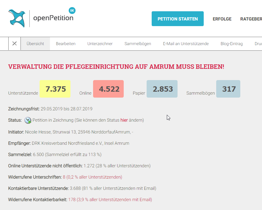 nun ist es soweit, die Petition wird morgen übergeben. Dafür mache ich mich auf den Weg nach Husum und werde natürlich berichten! Insgesamt haben 7375 Menschen unterschrieben und das beweist, dass dieses Thema nicht nur uns Amrumer bewegt.