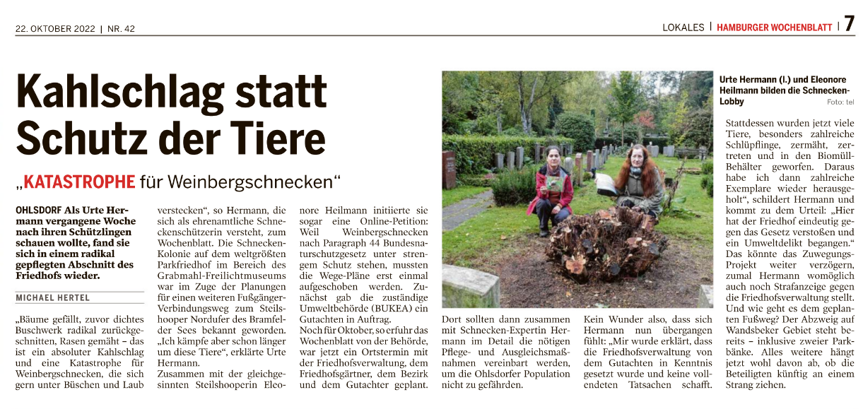 Am Samstag den 15.10.2022 bat mich Urte Hermann zum Treffen mit Herrn Michael Hertel vom Hamburger Wochenblatt - Bramfeld/Steilshoop - , direkt neben dem Grabmal-Freilichtmuseum (Ohlsdorfer Friedhof) zu den Gräbern, wo die Weinbergschnecken leben. Es gab ein riesen Kahlschlag, denn große Büsche u.a. wurden enorm abgesägt und geschreddert. Urte Hermann fand auch auf der Seite vom Friedhofszaun in der Nähe vom Grabmalfreilicht-Museum und der anderen Seite beim Bramfelder See Weinbergschnecken. Natürlich wurde statt Schutz der Weinbergschnecken und andere Tierarten geschreddert. Herr Michael Hertel berichtete, wie er es verstand etwas anders... Hamburger Wochenblatt - Bramfeld/Steilshoop Nr. 42/46. Jahrgang - 22.10.2022 - Seite 3 und 7 - LOKALES - "Kahlschlag statt Schutz der Tiere"...