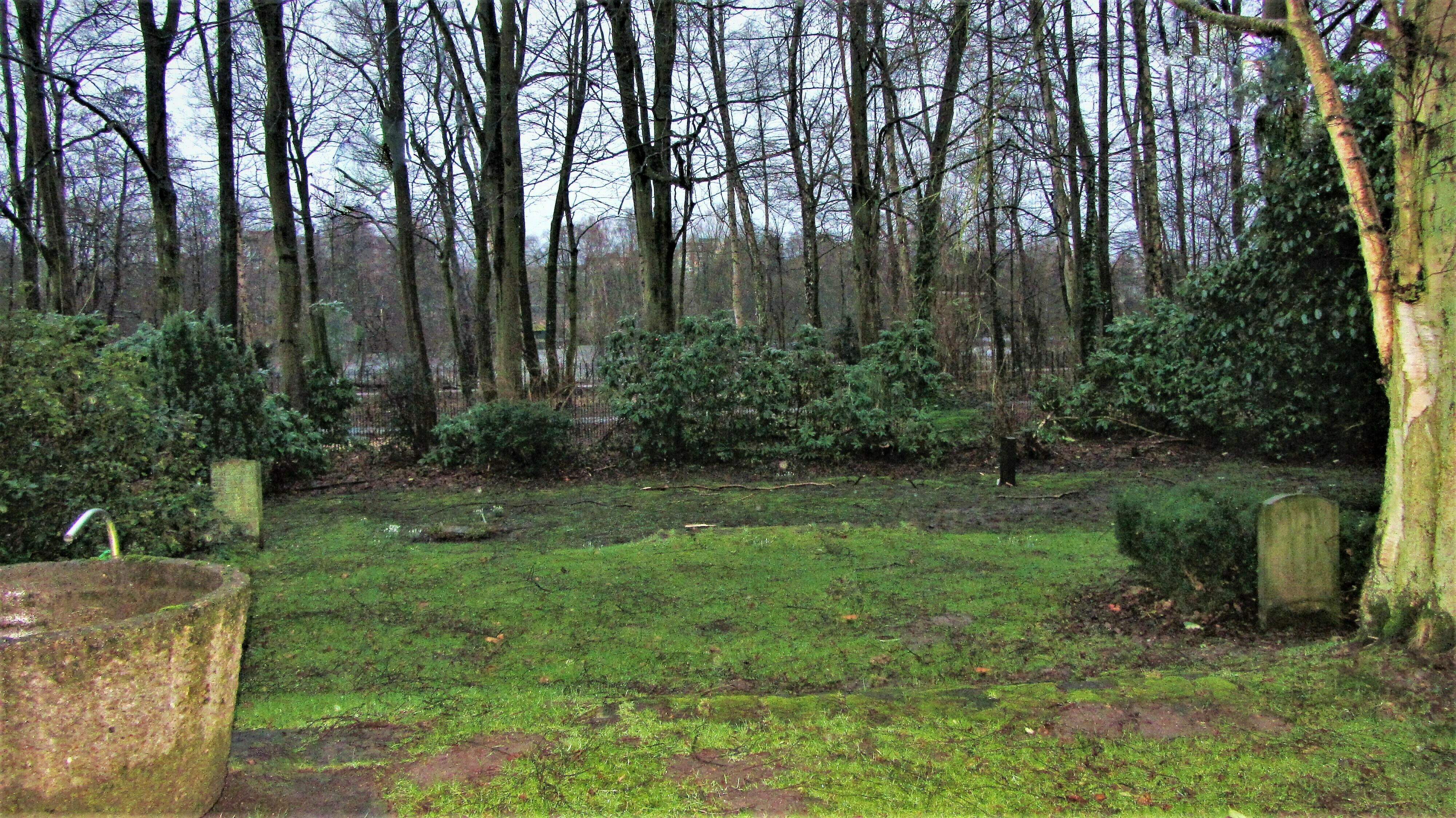 Hinter den Grabmal-Freilichtmuseum sind keine Gräber, sondern daneben Rasen mit Treppen unter Denkmalschutz, Rhododendren und Baumreihen -.
