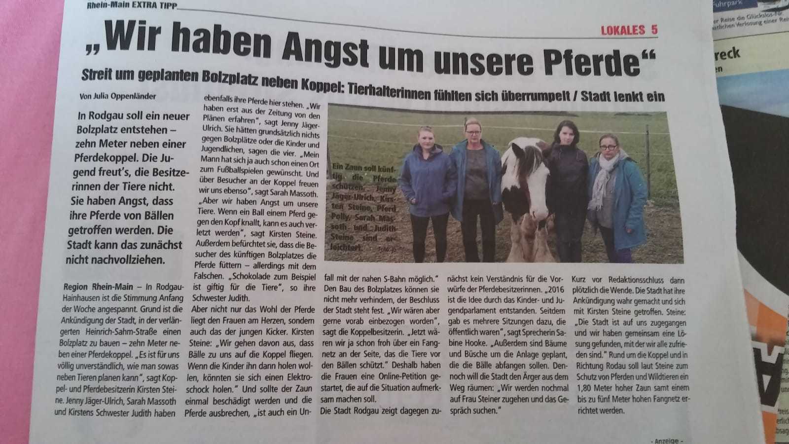 Die Stadt Rodgau ist auf uns aufmerksam geworden. Am Freitag haben wir eine Einigung mit der Stadt erzielen können. Es wird ein hoher Ballfangzaun in Richtung unserer Koppel errichtet und außerdem noch heimische Bäume gepflanzt.