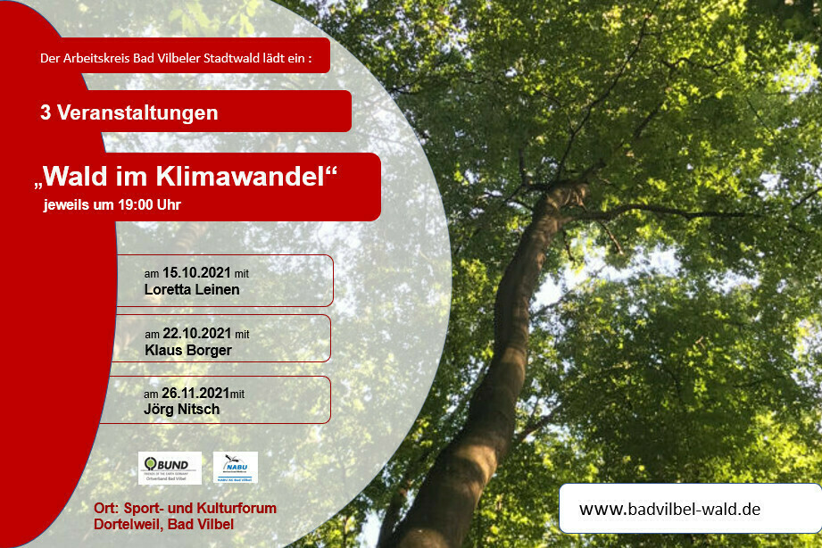 Am 22.10.2021 wird Herr Klaus Borger um 19:00 Uhr im Sport- und Kulturzentrum Dortelweil, Bad Vilbel einen Vortrag halten. Dies wird ein Beitrag eines Försters, der schon seit Jahren den ihm anvertrauten Wald so bewirtschaftet, wie wir uns das in Bad Vilbel vorstellen. Wer zu dem Vortrag nicht kommen kann, hat die Möglichkeit, sich ein Video anzuschauen, das wir ebenfalls auf unsere Website stellen werden. Zudem werden wir am 22.10. unsere Vorschläge für die Kommission kurz vorstellen und wünschen uns wie letzte Woche auch eine Diskussion mit den Teilnehmerinnen und Teilnehmern.