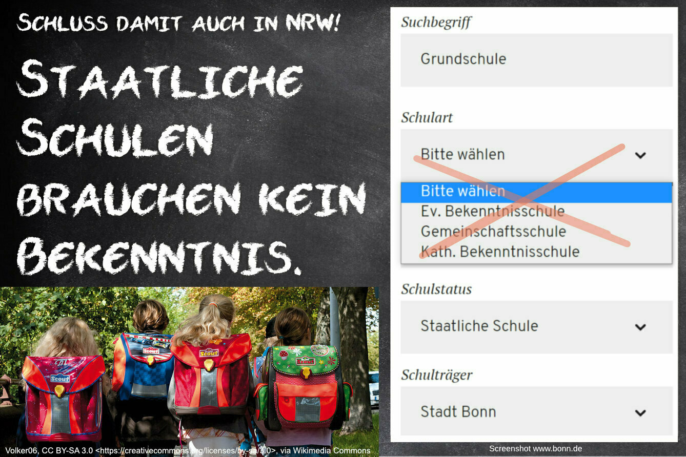 Vielen Dank allen, die unser Anliegen in diesen ersten Tagen schon unterstützt haben. Die meisten Unterschriften kamen bislang aus Bocholt. Kein Wunder: Dort sind 7 der 10 Grundschulen katholisch, an 2 davon gab es einen Anmeldeüberhang. Viele Eltern standen vor der Situation, dass sie ihren Kindern erklären mussten, was man nicht wirklich erklären kann. Dass ihre Religion oder auch die Entscheidung, dass Kind (noch) nicht zu taufen, dazu geführt hat, dass es nicht mit den Freunden aus dem Kindergarten auf die Schule vor Ort gehen darf. Viele Unterstützer kommen auch aus Olpe: Dort sind 3 der 4 Grundschulen katholisch. Und eine Gruppe von Aktiven hat dort eine Initiative gestartet, eine der katholischen Grundschulen umzuwandeln. Dort kamen über 900 Unterschriften zusammen! In Bonn sind auch schon einige Unterschriften zusammengekommen. Hier gibt es seit 2009 immer wieder Ärger um die Aufnahme von Kindern an Bekenntnisgrundschulen, und immer wieder Zeitungsartikel zum Thema in der Lokalzeitung. Trotzdem hat man auch hier das Gefühl, immer wieder bei Null anzufangen bei diesem Thema. Den wenigsten ist bewusst, dass trotz des "katholisch" oder "evangelisch" im Namen die Schulen komplett aus allgemeinen Steuermitteln bezahlt und unterhalten werden. Und dass andersgläubige oder ungetaufte Kinder von diesen Schulen im Zweifelsfall abgewiesen werden, will so manche/r einem nicht glauben. Absolut nachvollziehbar: Es ist ja auch unglaublich, dass das staatliche Schulsystem in NRW im Namen von Religion ausgrenzt.