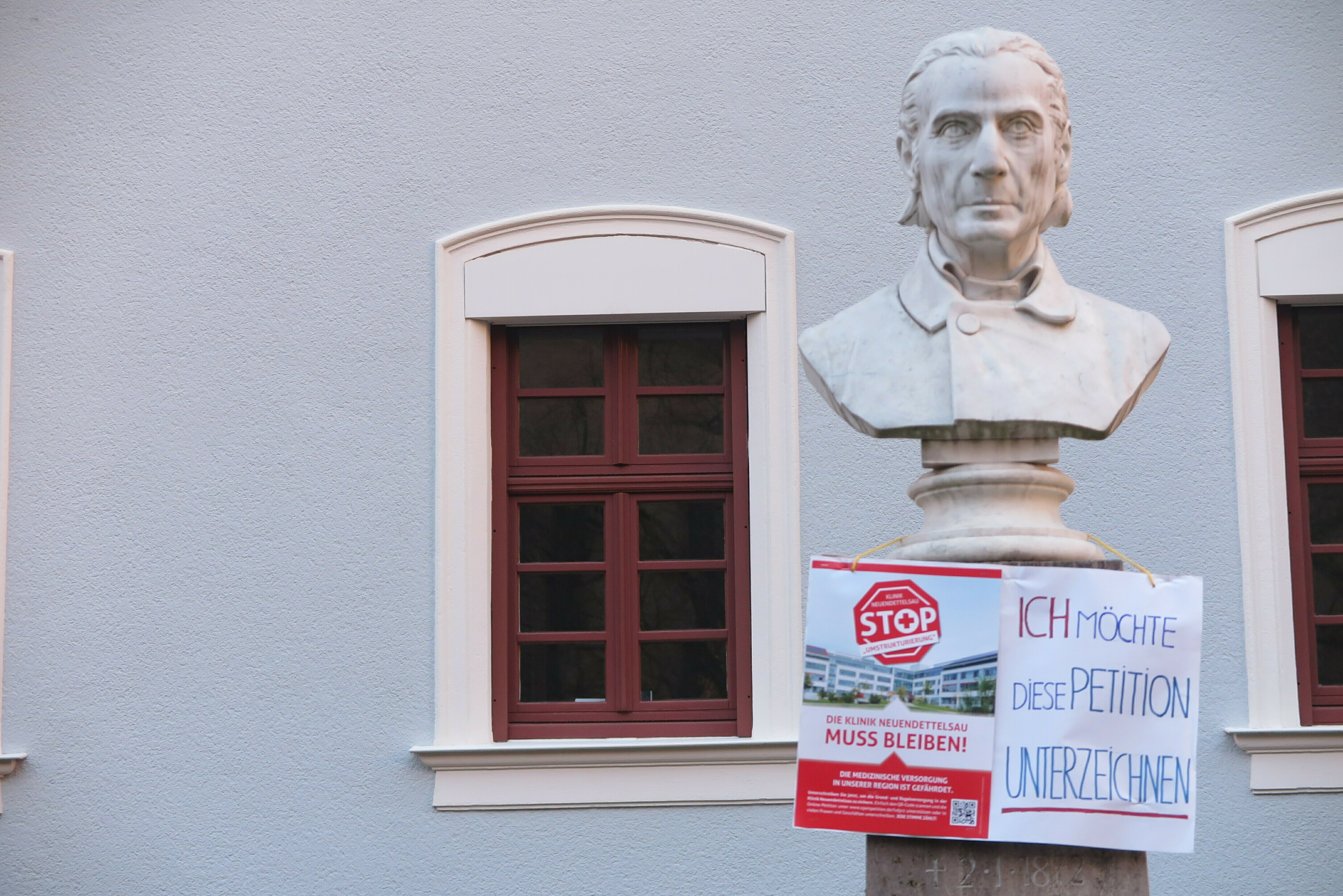 Die Übergabe ist mehr als ein formaler Akt. Denn die Adressaten der Petition werden darin aufgefordert, an einem Runden Tisch Lösungen dafür zu finden, dass die Menschen im östlichen Landkreis und darüber hinaus weiterhin in "ihrer" Klinik umfassend hervorragend versorgt werden. Deswegen sollten wir unserer Forderung anlässlich der oben genannten Termine nochmals Nachdruck verleihen: Kommen Sie zu den Übergaben! Zeigen Sie mit Ihrer Anwesenheit (und eventuell Plakaten), dass Ihnen die Zukunft der Klinik Neuendettelsau wichtig ist. Machen Sie es wie Wilhelm Löhe, der an seinem 150. Todestag für "seine" Klinik demonstrierte (Foto).