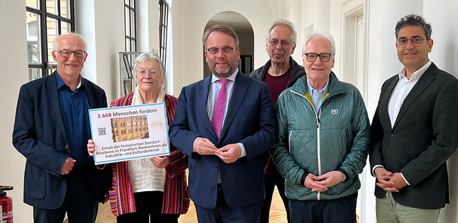 Die Petition gegen den Abriss des Gebäudes der Dondorf-Druckerei wurden am 28. Mai 2025 dem neuen Minister für Wissenschaft und Forschung, Kunst und Kultur, Timon Gremmels als zuständigem Minister für das Gebäude, übergeben: Über 3500 Unterschriften. Der Minister bedankte sich ausdrücklich für die geleistete ehrenamtliche Arbeit. Die anwesenden Mitglieder der Initiative Dondorf-Druckerei und des Vereins der Freunde Bockenheims, Cordula Kähler, Hans Oetzel, Konrad Götz und Willy Breder, nahmen den Dank stellvertretend auch für die weiteren Mitglieder der beiden Initiativen entgegen. Diese hatten nicht nur die Petition im Sommer 2023 ins Leben gerufen, sondern entscheidende inhaltliche Vorarbeiten geleistet, um die Geschichte des Gebäudes im Stadtteil Bockenheim und in der Stadtgesellschaft Frankfurts bekannt zu machen.