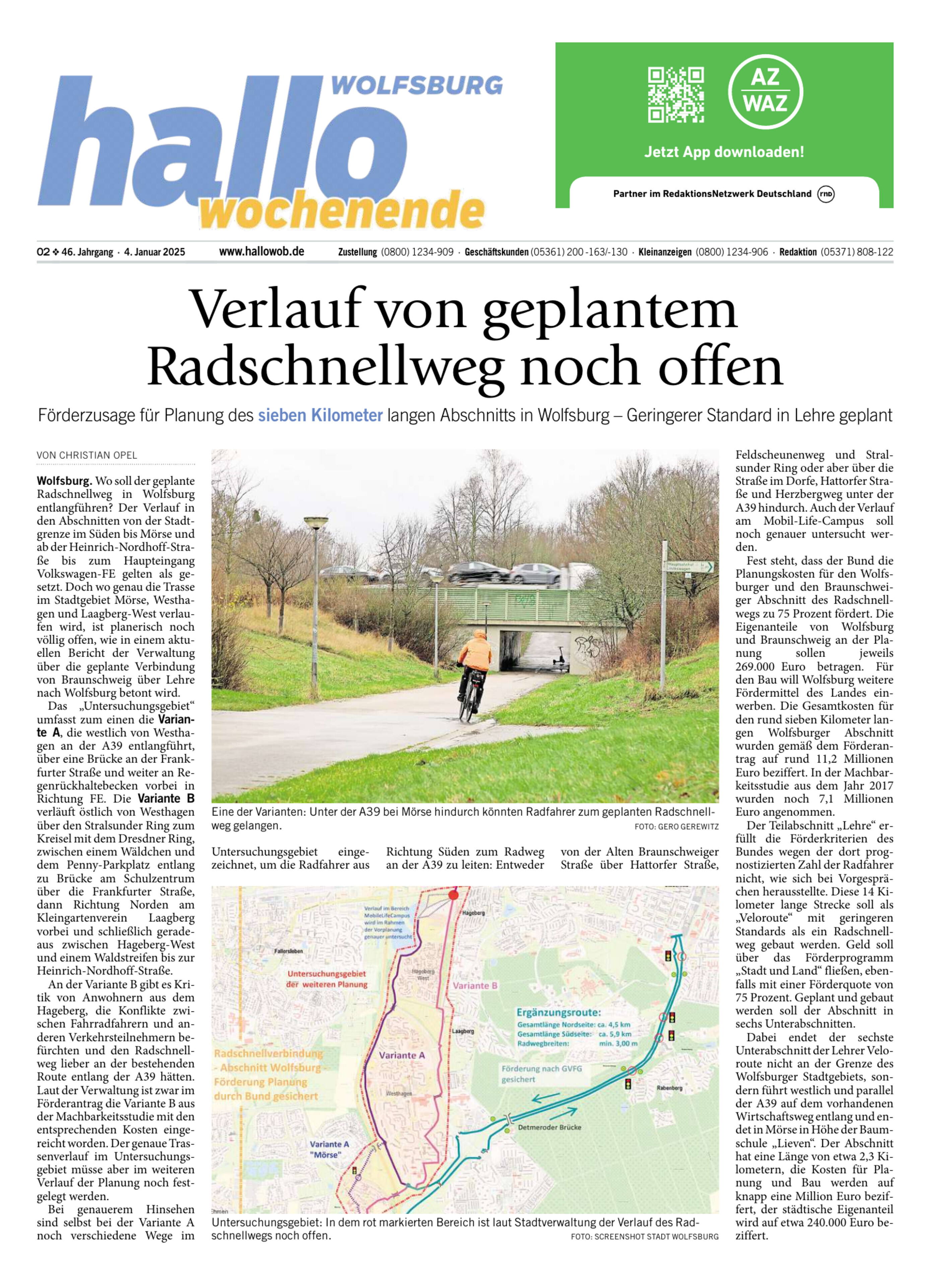 inzwischen konzentrieren sich die städtischen Planungen des Radschnellwegs auf den Bereich zwischen Mörse und der Heinrich-Nordhoff-Straße. Dem Artikel aus "Hallo Wochenende Wolfsburg" von heute ist eine Karte beigefügt, der den Verlauf möglicher Trassenführungen gut erkennen lässt. Die Entscheidung, ob die Trasse des Radschnellwegs über Westhagen, Laagberg, westlich des Hageberg-West und östlich des (alten) Hagebergs verlaufen soll (Variante B), was aus den Gründen unserer Petition abgelehnt wird, oder östlich an Westhagen und Hageberg-West vorbei entlang den Regenrückhaltebecken (Variante A) ist weiterhin offen. Wir bitten alle Befürworter unserer Petition, sich auch weiterhin im persönlichem Umfeld für die Variante A zu stark zu machen.