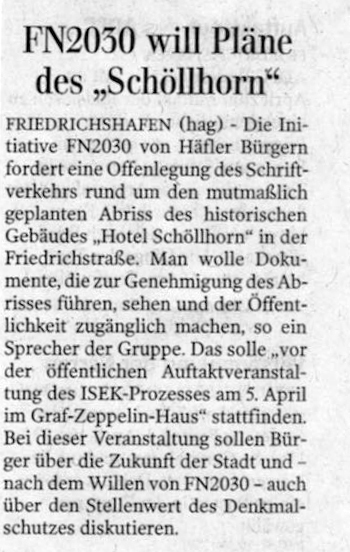 Zur weiteren Information: Am kommenden Dienstag um 18h30 findet im Graf-Zeppelin-Haus in Friedrichshafen die Auftaktveranstaltung zum "ISEK - Integriertes Stadtentwicklungs-Konzept" statt, die die Möglichkeit der Information zur städetbaulichen Zukunft, aber auch zum Austausch oder auch Nachfragen zu aktuellen Dingen wie unserem Hotel Schöllhorn bietet.