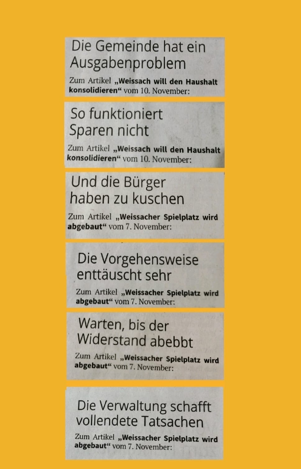 Anbei findet ihr die Überschriften der Leserbriefe, die aufgrund des Artikel über die „Wartung“ der Spielgeräte in der Mozartstrasse erschienen sind.